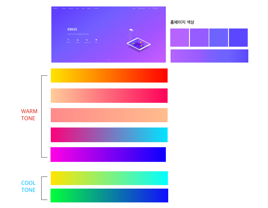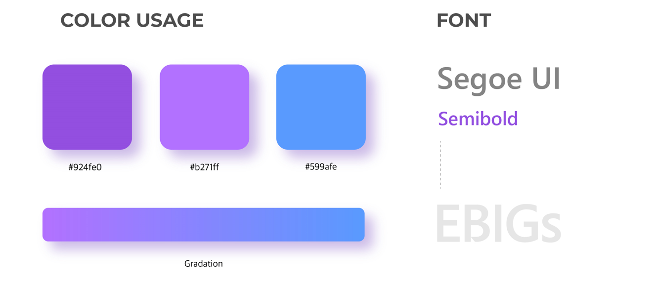 그래서, 중성색인 보라색을 EBIGs의 키 컬러로 결정하였습니다. 중성색은 난색이나 한색에 속하지 않으며, 시각적으로 따뜻하지도 차지도 않은 느낌을 주는데 이러한 색채의 느낌이 EBIGs(이빅스) 제품 이미지 중, 치우침 없이 모든 데이터들을 수집한다는 의미와 통할 수 있다고 생각했습니다.