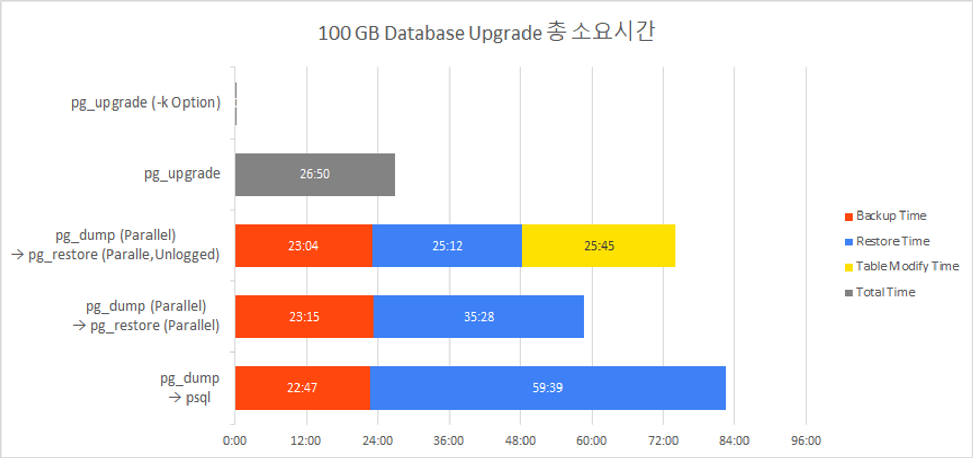 즉, pg_upgrade 응용프로그램을 제외하면 Backup과 Restore를 통한 업그레이드로 볼 수 있으며, ① pg_dumpall로 전체 Database Backup → psql로 Restore, ② pg_dump로 개별 Database Backup → psql 또는 pg_restore로 Restore 이 두 가지가 대표적인 조합으로 볼 수 있습니다.
