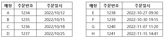 1) 데이터 유형 변환 : 앞에서 든 간단한 예시처럼 같은 속성(생년월일) 내에서 형식이 다를 때 동일하게 변경하는 것을 말해요. 엑셀에서 서식을 통일하는 것과 비슷해요! 예를 들어, 아래 '주문일시'처럼 형식이 다른 두 데이터가 있다고 할게요.