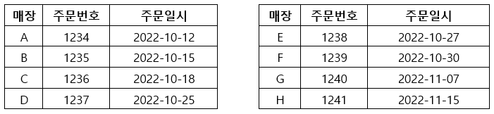 맞아요! 보통 데이터베이스에서 JOIN과 같은 기능으로 여러 개의 데이터 셋을 병합하여 다루는 작업을 많이 하죠. 이 또한 하나의 전처리라고 할 수 있어요. 아래의 예시로 확인해볼까요!? 아래와 같이 주문내역, 회원 리스트의 두 데이터가 있다고 할게요.