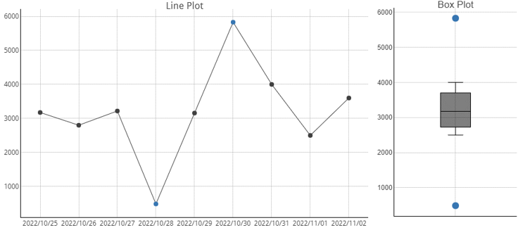 파란색 동그라미는 아까 봤던 매출표의 486(천원)과 5828(천원)을 의미하죠. 두 그래프의 1,000 이하의 값과 6,000에 가까운 값이 보이나요? 그래프로 보니 다른 값들의 분포에서 많이 벗어나는 게 보이죠? 이렇게 이상치를 판별하고, 제거하는 작업을 KNIME으로 할 수 있어요.