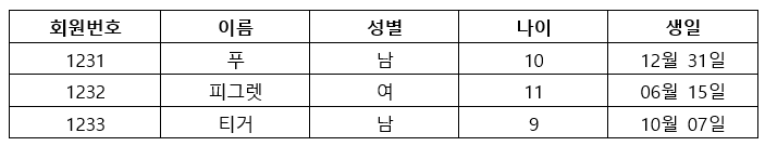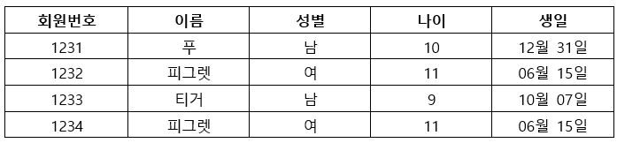 2) 중복 제거 : 중복 데이터를 제거한다는 것은 너무 중요해요. 중복된 데이터로 인해 분석 결과가 한쪽으로 치우칠 수 있어요. 예를 들어볼게요! 아래의 표를 보면 피그렛(여/11세/6월 15일)이 두 회원번호를 가지고 있어요. 한 사람이 두 번 가입해서 생긴 중복이라 가정할게요.