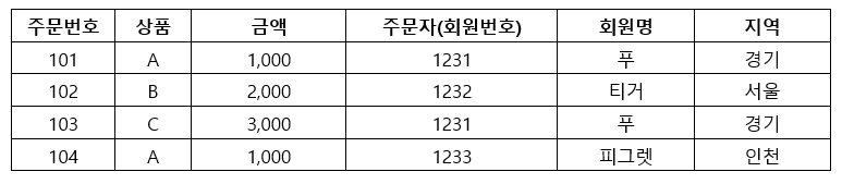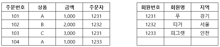 왼쪽 주문내역의 '주문자' 속성이 오른쪽 회원 리스트의 '회원번호'와 같다고 할 때, 주문내역에 회원 정보를 합쳐볼게요.