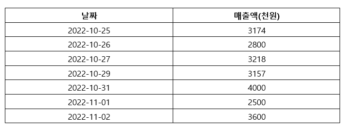우선, 가장 먼저 값이 하나도 없는 행을 봐주세요. 바로 위 ‘날짜’가 10월 29일이고, 아래가 10월 30일이므로 이 행(Row)은 단순 제거할게요. 다음으로 ‘강수’가 비어 있는 곳을 봐주세요. 모두 ‘강수 확률’이 0인 경우예요. 그렇다면 이 결측은 ‘X’로 채워줄게요. 마지막으로 ‘기온’이 비어 있는 곳을 봐주세요! 기온은 보통 연속적이므로 직전 기록과 직후 기록의 평균으로 채우면 어떨까요?