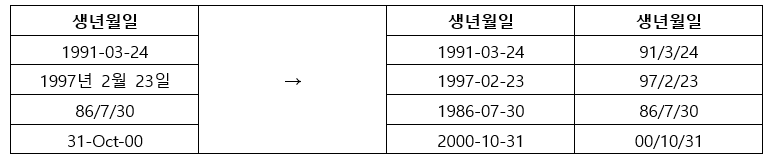 왼쪽 생년월일을 보면 여러 형식으로 저장되어 있어요! 모든 방식이 날짜를 뜻하지만, 숫자의 길이도 다르고 숫자 사이를 구분하는 문자(‘-‘ 나 ‘/’)도 다르죠? 보기에도 힘들고, 컴퓨터조차 날짜로 인식하지 못해요. 예시처럼 왼쪽 생년월일과 같은 데이터를 오른쪽 생년월일과 같은 데이터로 만들어주는 작업이 바로 전처리예요! 데이터 전처리 중에 극히 일부분이니 이 부분 참고해주세요.