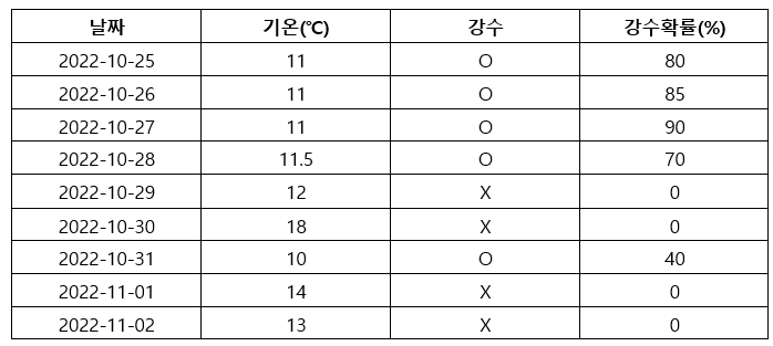 우선, 가장 먼저 값이 하나도 없는 행을 봐주세요. 바로 위 ‘날짜’가 10월 29일이고, 아래가 10월 30일이므로 이 행(Row)은 단순 제거할게요. 다음으로 ‘강수’가 비어 있는 곳을 봐주세요. 모두 ‘강수 확률’이 0인 경우예요. 그렇다면 이 결측은 ‘X’로 채워줄게요. 마지막으로 ‘기온’이 비어 있는 곳을 봐주세요! 기온은 보통 연속적이므로 직전 기록과 직후 기록의 평균으로 채우면 어떨까요?
