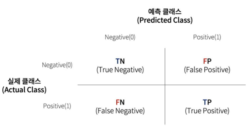 이때 각 항의 의미는 모델의 성능을 평가하기 위하여 고안된 표인 아래의 혼동행렬을 통해 이해할 수 있다.