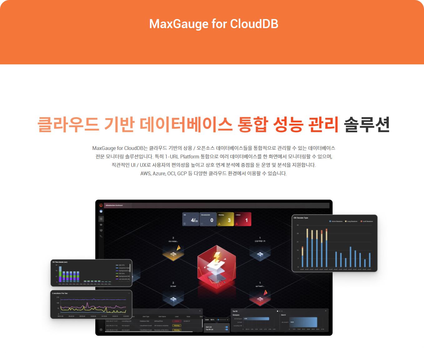 MaxGauge for Cloud는 클라우드 기반의 상용 ∙ 오픈소스 데이터베이스들을 통합적으로 관리할 수 있는 데이터베이트 전문 모니터링 솔루션으로 AWS, Azure, OCI, GCP 등 다양한 클라우드 환경에서 경험할 수 있습니다.