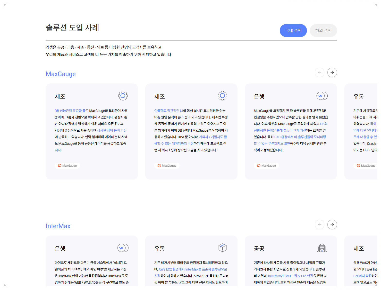 메인 페이지에 기술 카테고리 별로 엑셈의 솔루션들을 정리하고, 카드 슬라이드 형태로 흘러가 접근이 재밌으면서도 쉽게 했습니다. 바로가기를 누르면 제품 상세 페이지로 링크됩니다.