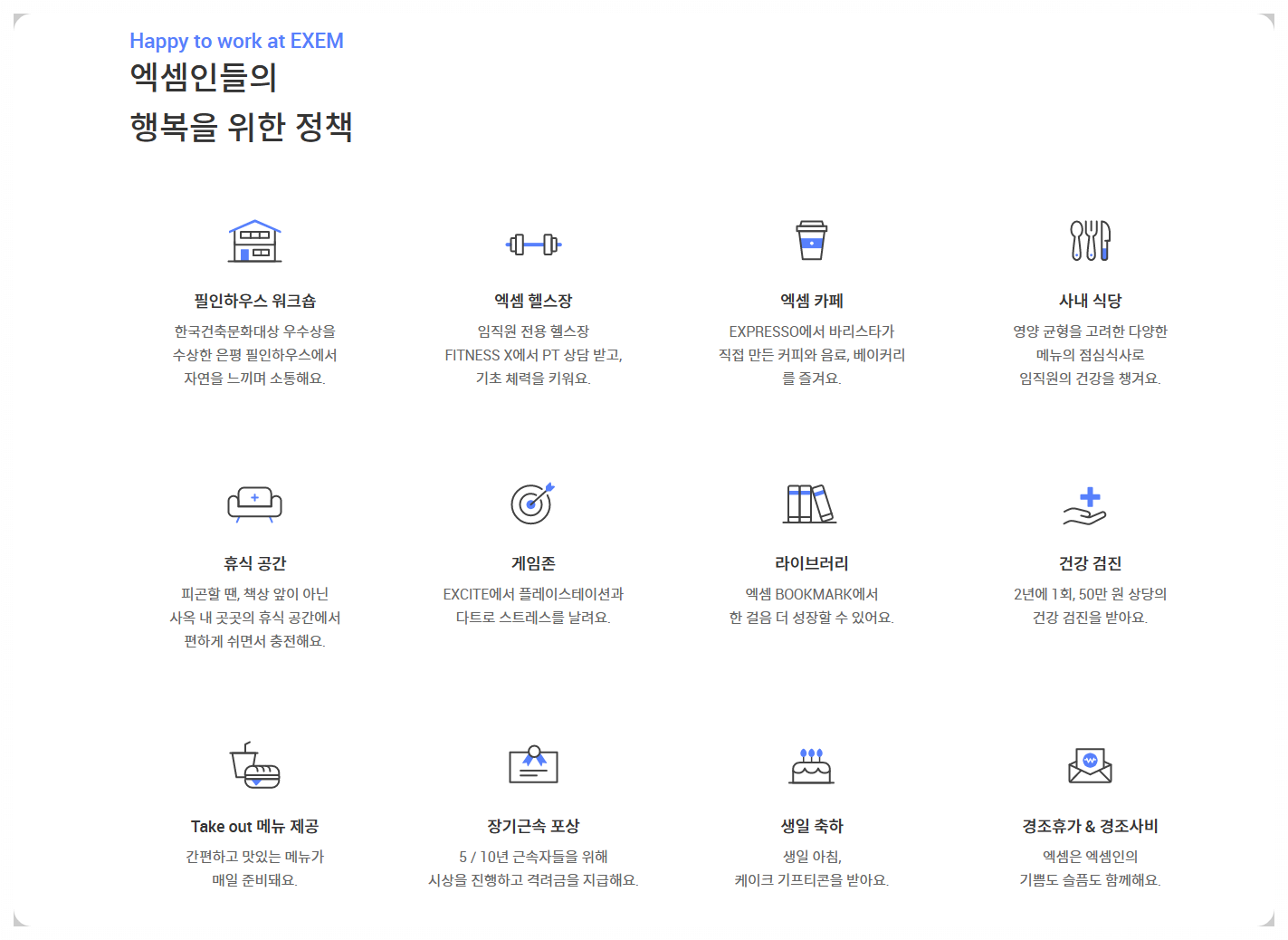 엑셈 구성원들은 더 나은 방향을 찾기 위해 서로 기꺼이 조언을 나누며, 존중과 신뢰를 바탕으로 친구와 같은 친밀한 관계를 쌓아갑니다. 일 뿐만이 아닌 다양한 삶의 가치를 존중하고 개인의 행복이 회사의 성장에 연결되도록 합니다. 엑셈 문화를 바탕으로 한 생활 규칙과 복지 정책까지 엿볼 수 있는, 엑셈에서 함께 성장하고 싶은 누군가라면 꼭 눈여겨 보아야 할 페이지입니다.