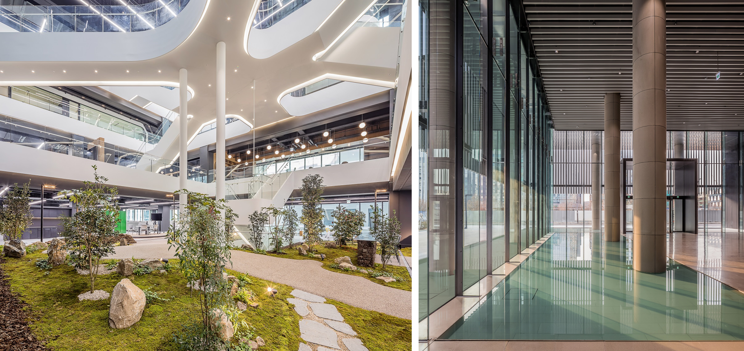 공간에 활기를 주는 자연 친화 공간도 마련됐다. 관엽 식물과 활엽수들 사이에서 산책할 수 있는 실내 정원 ‘데이터 포레스트’와, 건물 밖에서부터 로비까지 물이 흘러 연결되는 대형 수반이 있다. 또한 해의 움직임에 따른 자연광 유입을 계산해 적절한 조도를 선사하는 건물 외벽 루버를 배치해 직원의 눈 피로도를 줄임과 동시에 태양일사로 인한 내부 온도 변화을 줄여 에너지 절약 효과를 보도록 했다.