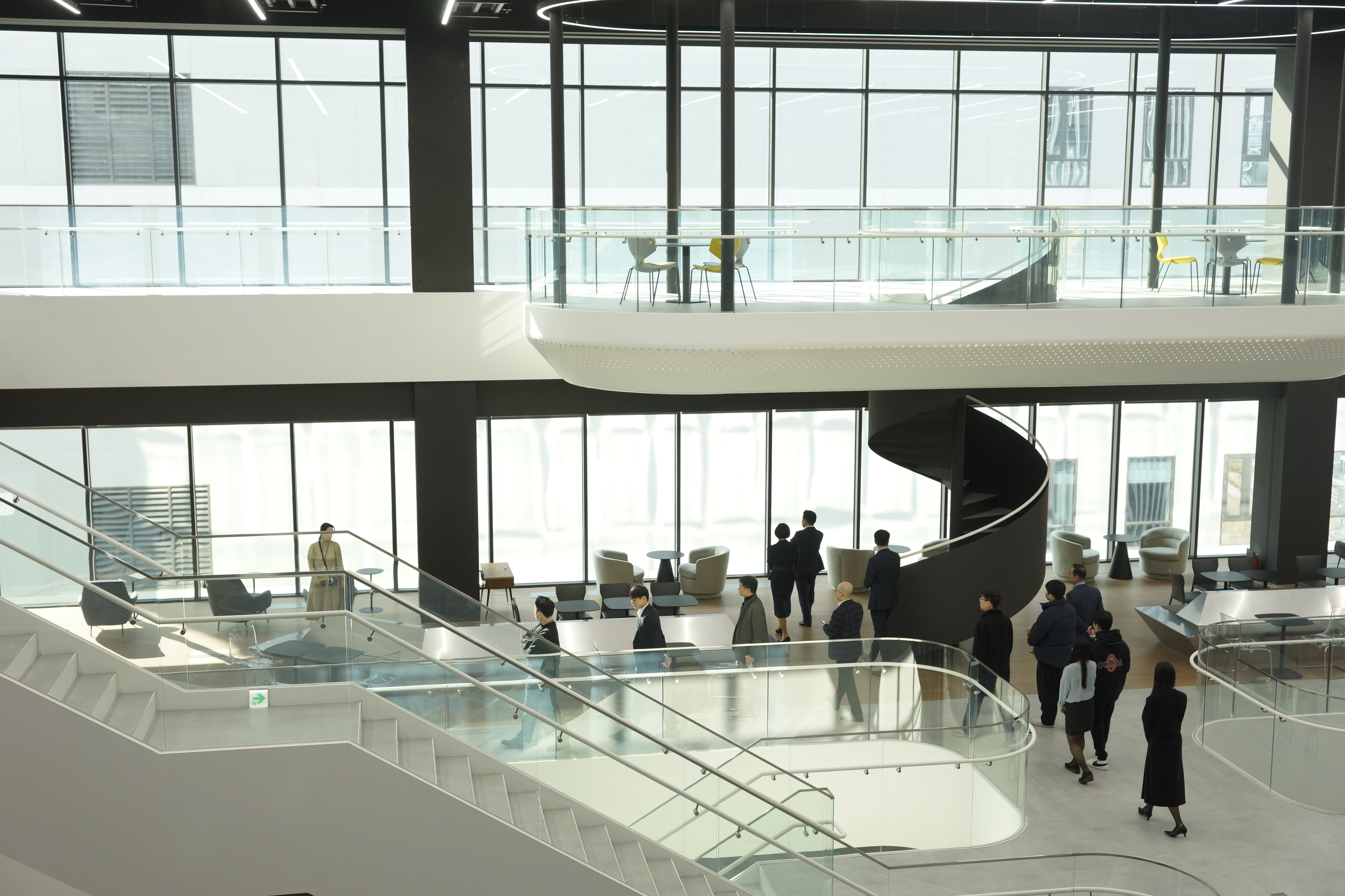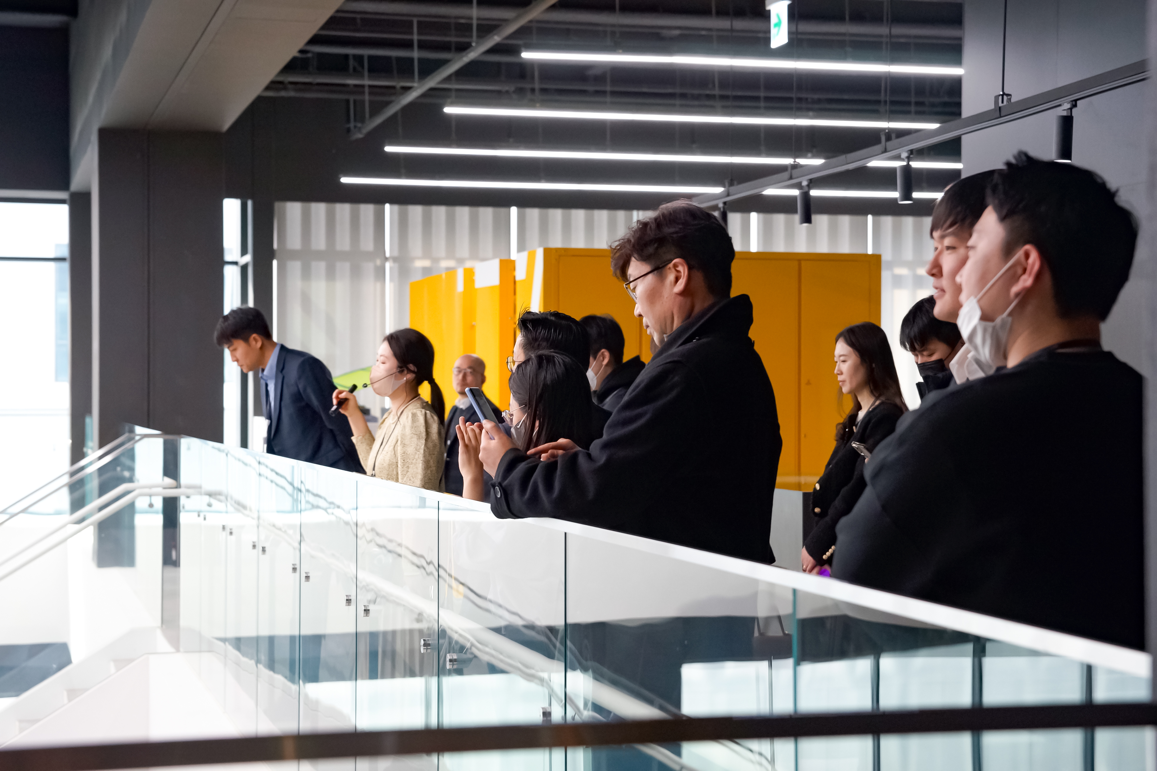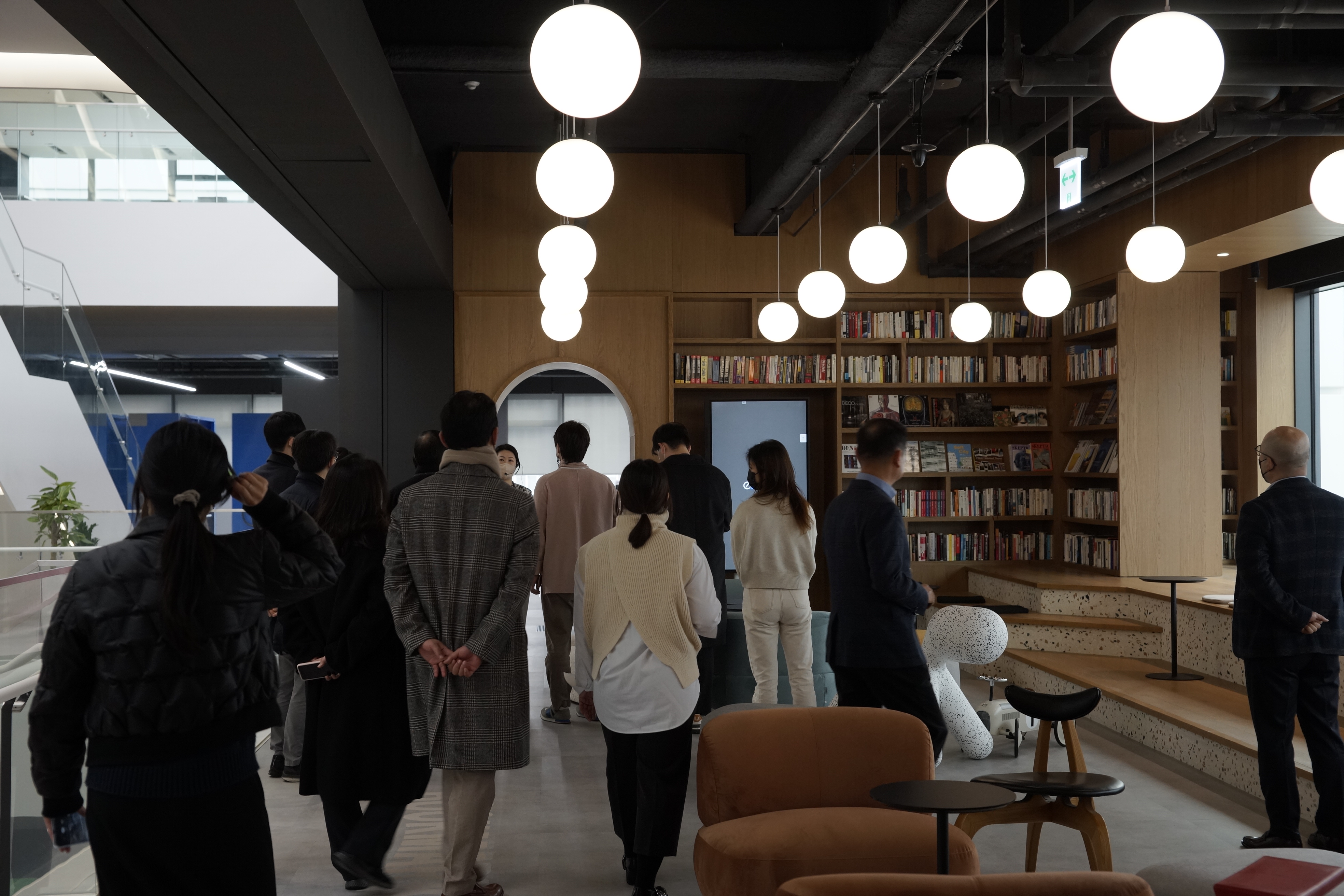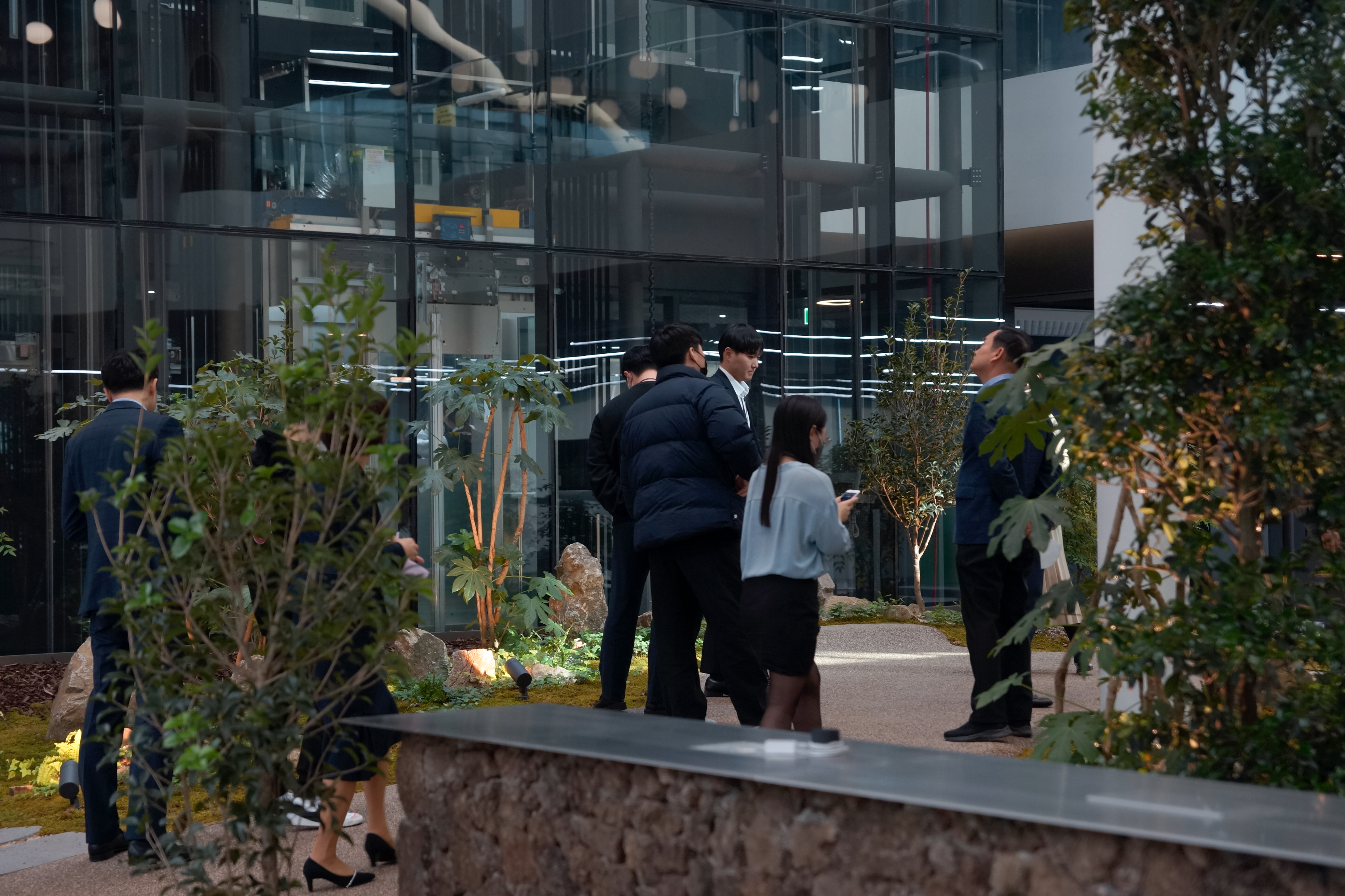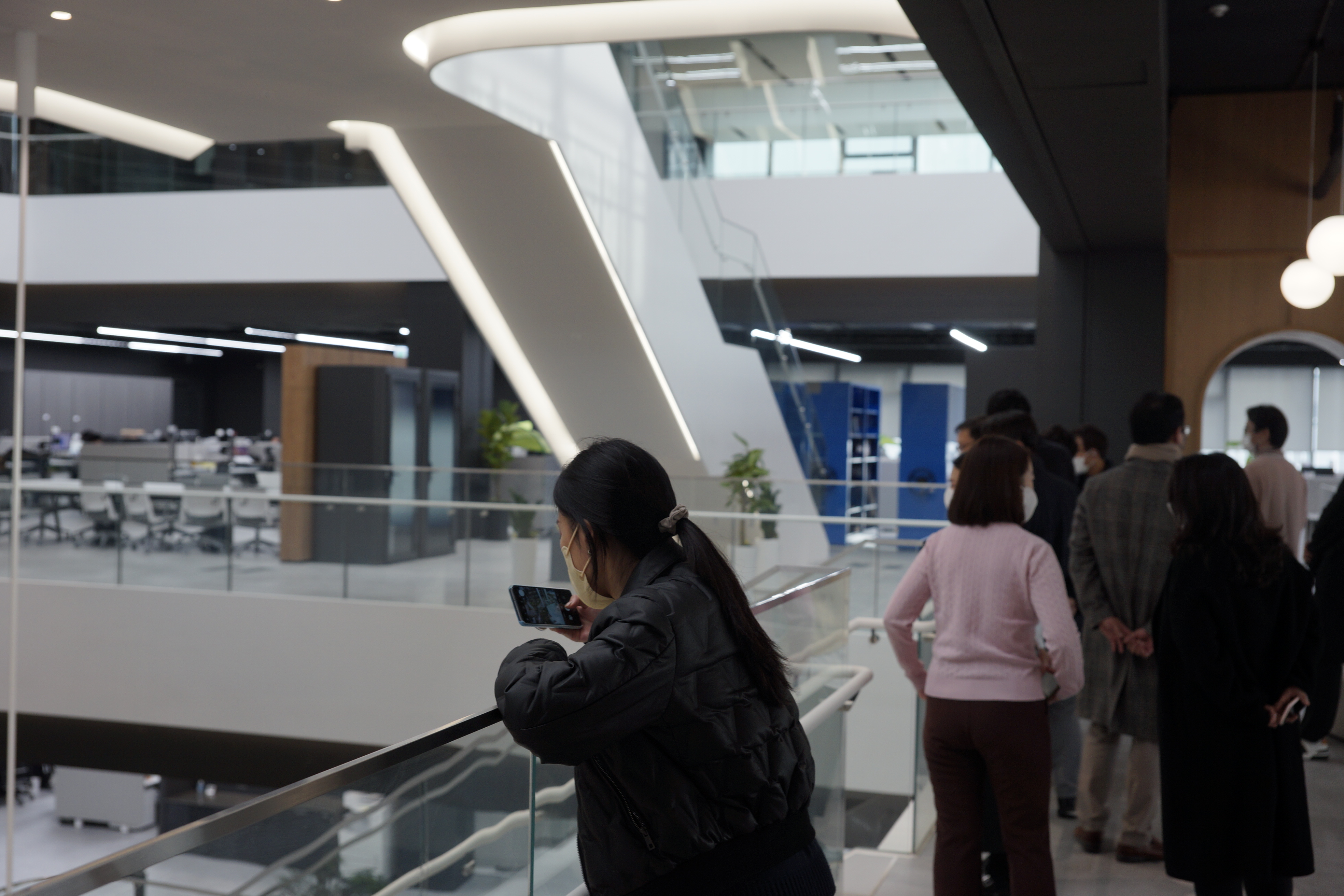 바로 이 자리! 현장에서 뻥~ 뚫린 보이드를 보는 개방감은 '단연코 최고'라는 찬사를 보내주십니다. 지금껏 여러 회사의 입주식을 다녀왔지만, 이런 설계와 구조는 처음이라고 하시네요.