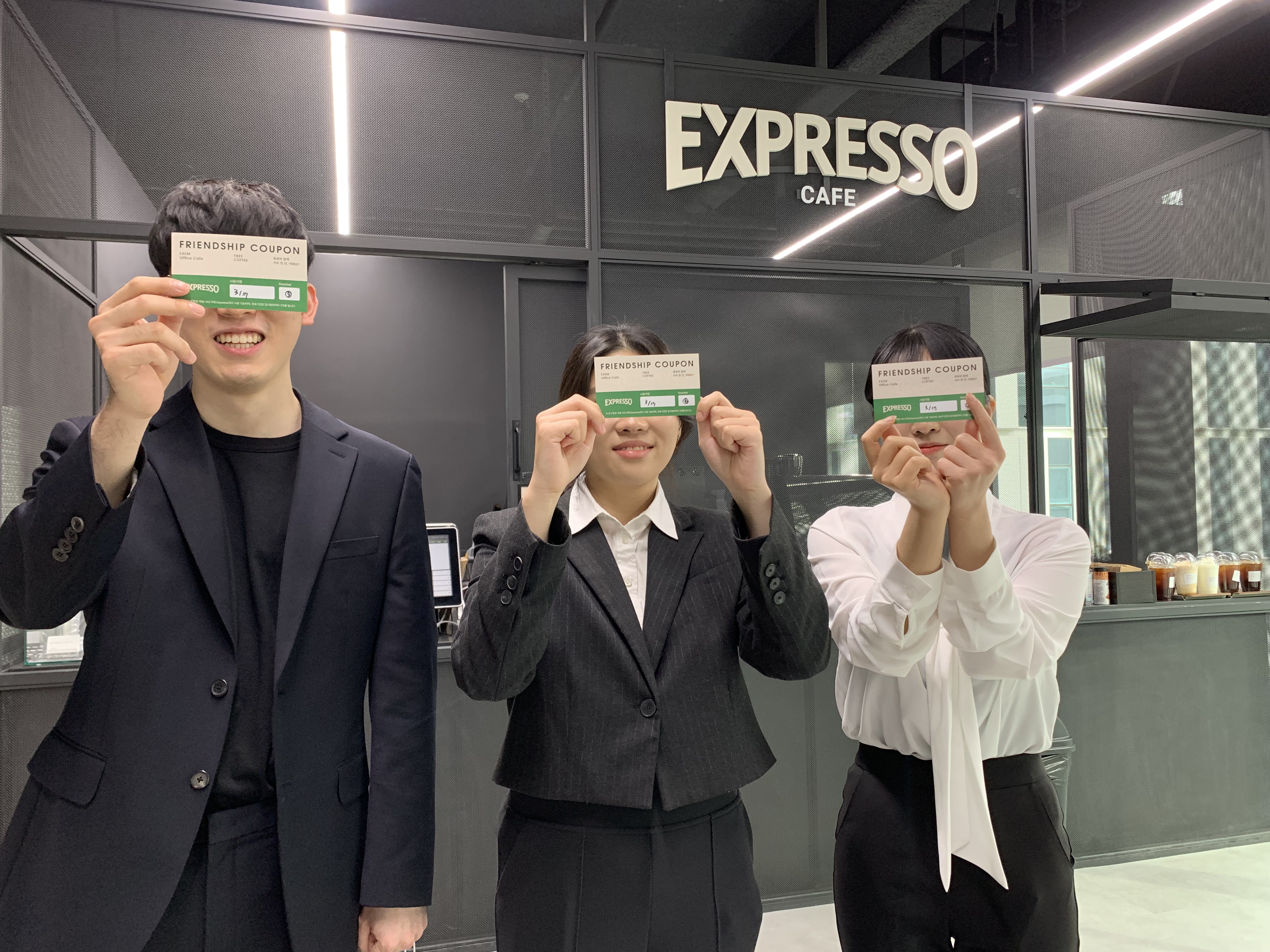 2차 면접 후에는 엑셈 카페에서 이용 가능한 EXPRESSO 음료 쿠폰을 드렸습니다. 면접이 끝나고 엑셈 카페에서 면접자들끼리 꽤 오랜 시간 수다가 이어졌습니다. 이 모습을 지켜보며 "라떼는 말이야~"