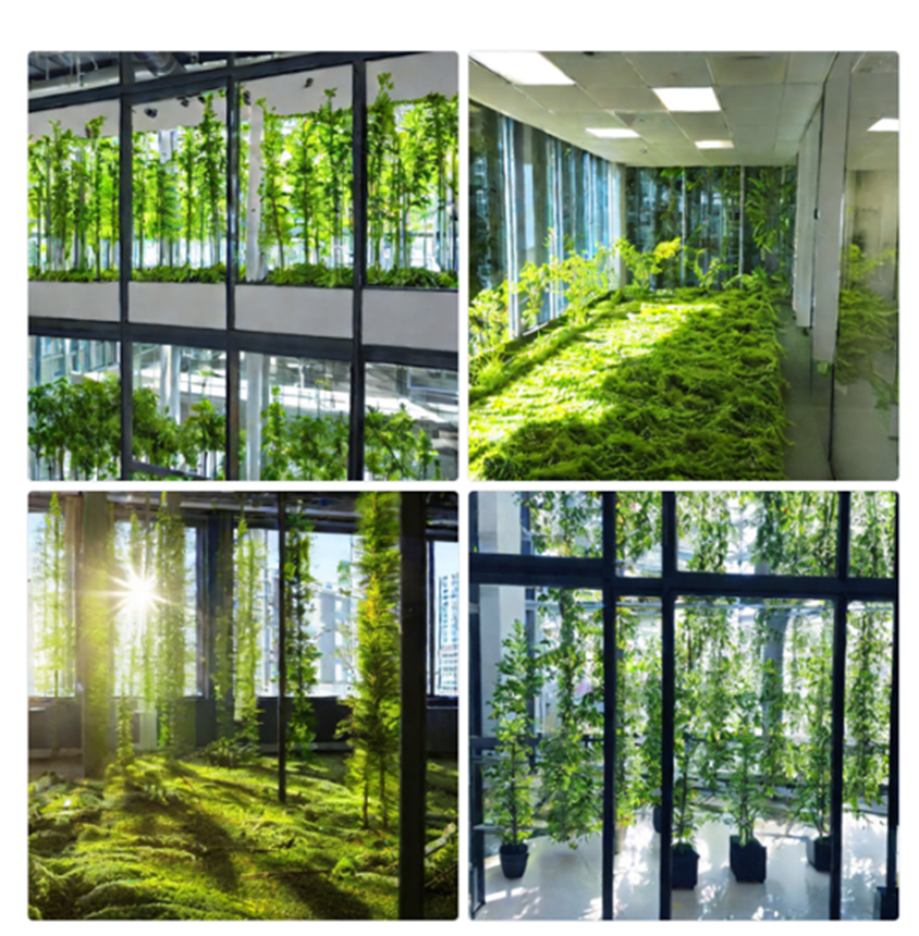 어느 사무실 한 켠에서 직접 찍은 사진인가 싶어 여쭤보니, 스테이블 디퓨전을 이용해 ‘봄 햇살, 회사, 숲’을 키워드로 넣어 5분 만에 생성된 이미지라고 합니다.