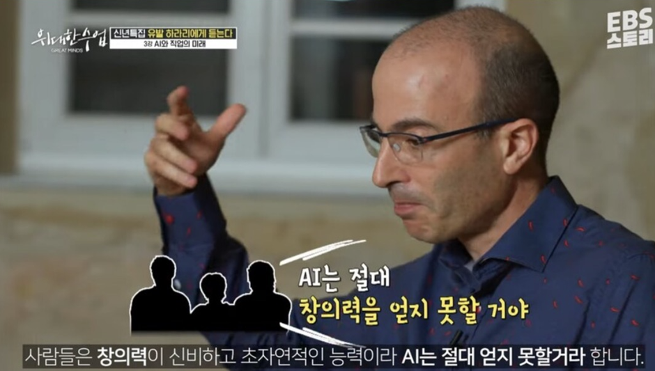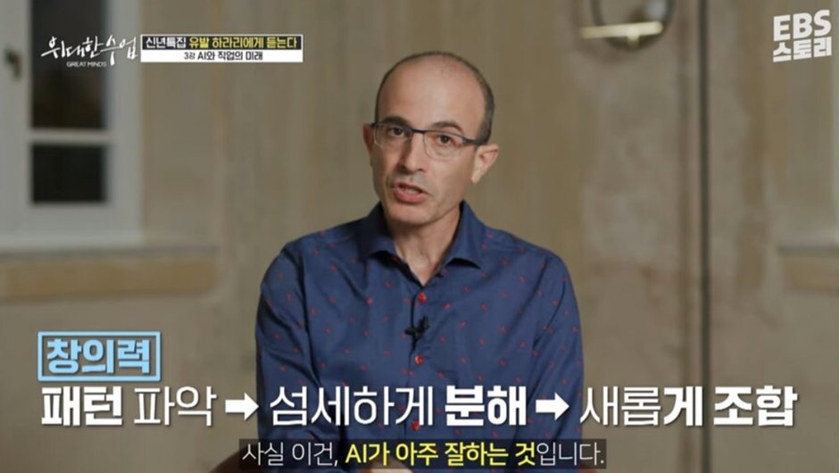 EBS 위대한 수업에서 『사피엔스』의 저자인 유발 하라리는 이와 다른 주장을 했습니다. 창의력은 일정 패턴을 파악해서 작은 단위로 분해한 후 이를 새롭게 조합하는 것이며, 이는 AI가 아주 잘하는 것이라고! 그래서 대부분 지위가 낮고, 창의적이지 않으며, 노동을 요구하는 직종부터 AI가 대체할 것이라 하지만, 이와 반대로, 지위가 높고 창의적인 직업부터 빠르게 대체될 확률이 높다는 말이지요.