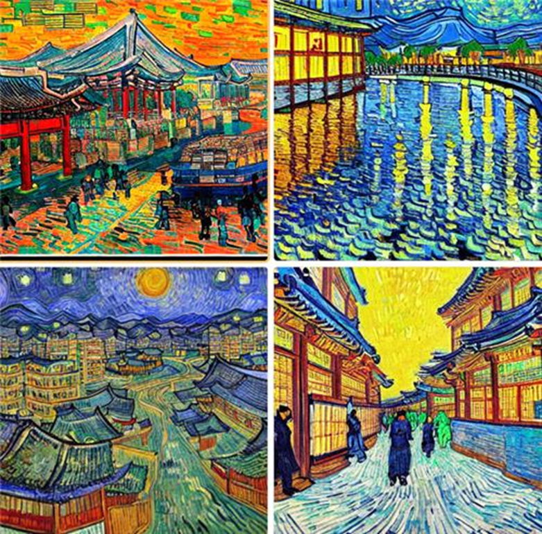 현재 IT 업계가 텍스트 생성 도구인 챗GPT로 떠들썩하다면, 예술계에서는 영국 스타트업 '스태빌리티AI'가 개발한 스테이블 디퓨전이 화두입니다. 스테이블 디퓨전은 그림 생성 AI 모델입니다. 이 창작 그림 생성기에게 반 고흐 스타일로 서울을 표현해보라고 했더니 아래와 같이 이미지를 만들어 냅니다.
