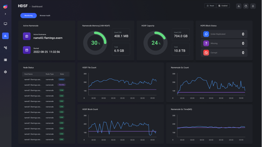 Hadoop Eco System 중 Flamingo는 각 서비스와 서버의 정보를 실시간으로 수집하여 DBMS에 저장하고 Dashboard, Monitoring 등 여러 메뉴의 특징에 맞게 정보를 제공합니다. 위의 이미지는 Flamingo의 Monitoring 페이지로, 실시간 데이터를 활용하여 서버와 관련된 서비스 정보를 제공합니다. (이외에 EBIGs의 자세한 기능이 궁금하다면 링크를 참고해주세요)