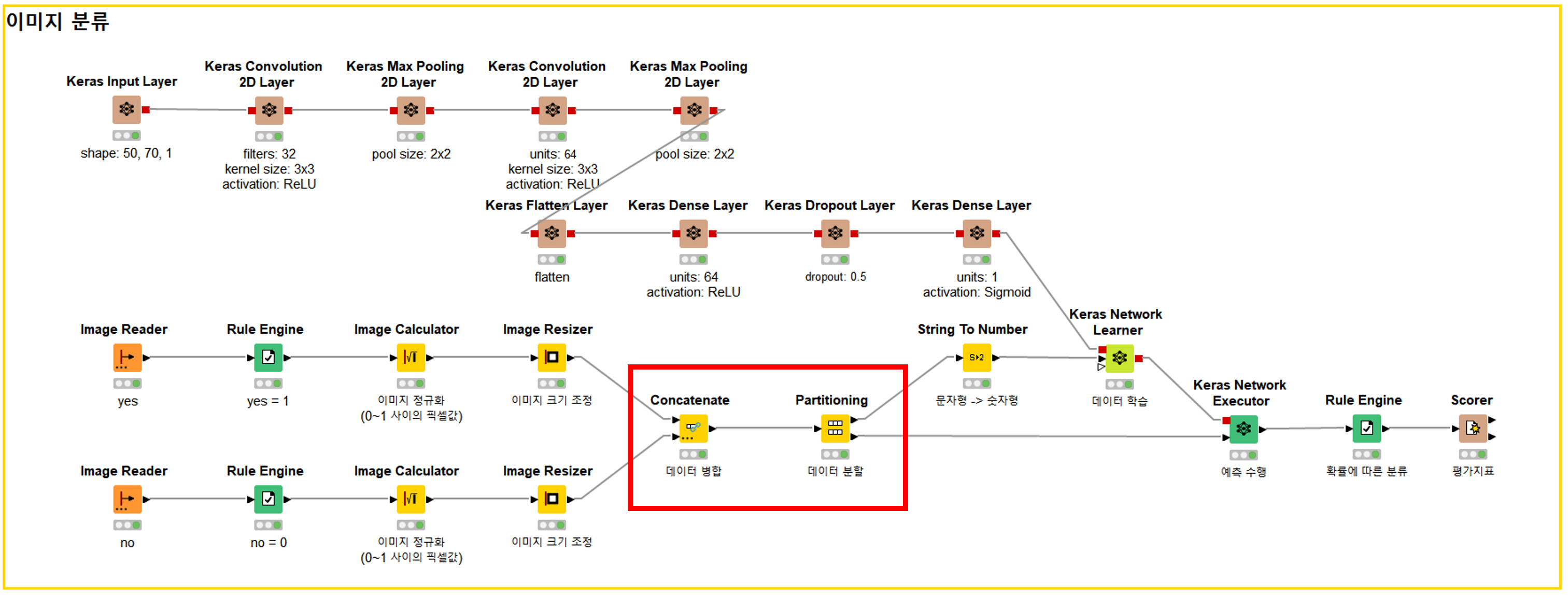 윗줄의 양성 데이터와 아랫줄의 양성 데이터를 받아서 <Concatenate>를 이용해 하나로 합친 다음 <Partitioning>을 이용해 훈련 데이터와 테스트 데이터로 나누어주었어요. 이때, 검증 데이터는 일단 생략할게요!