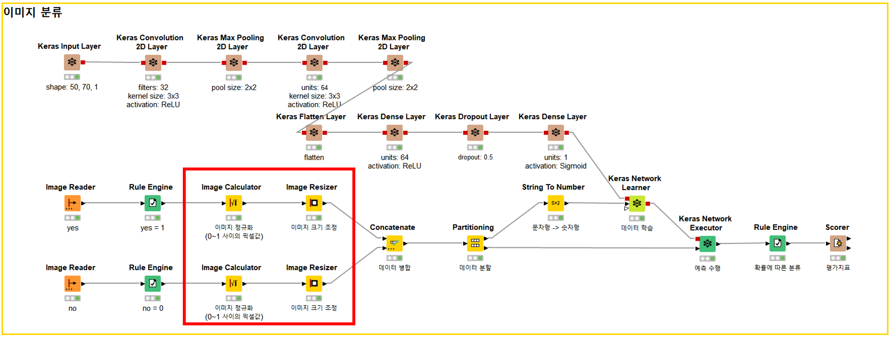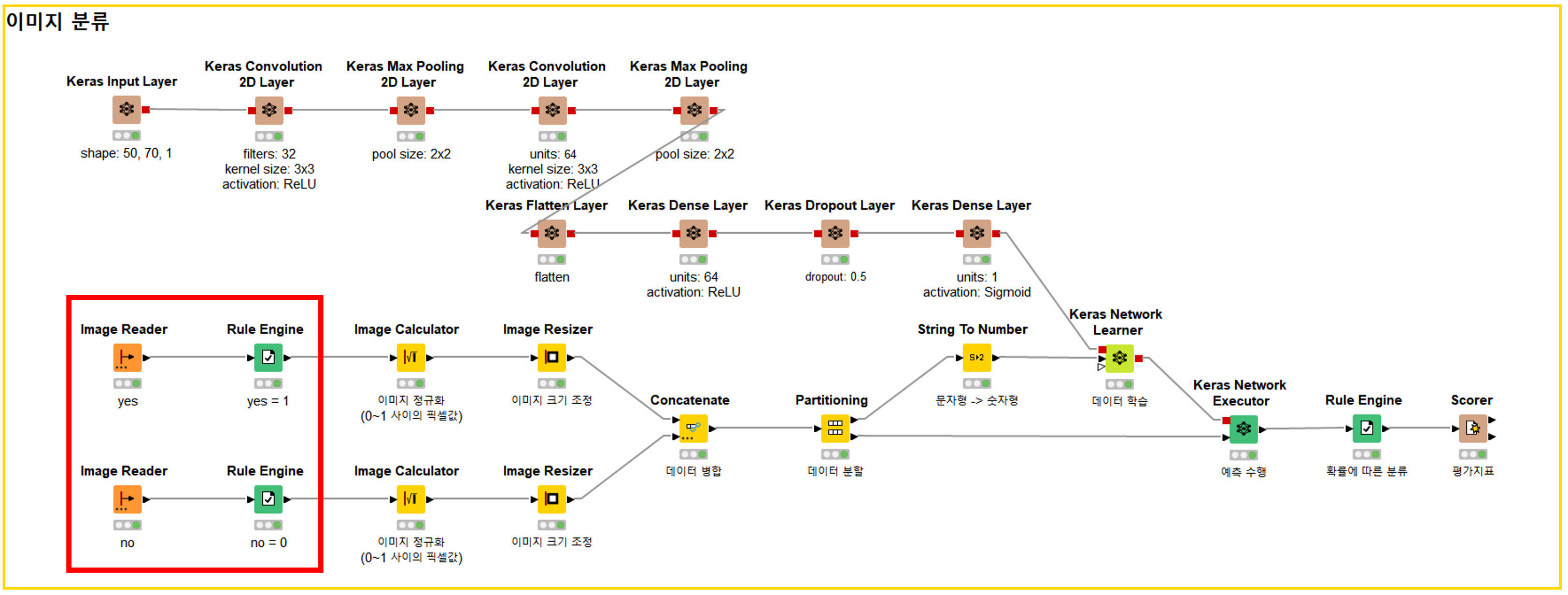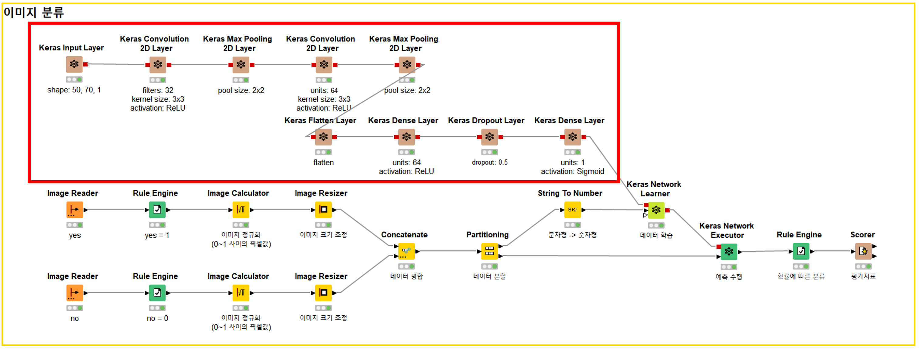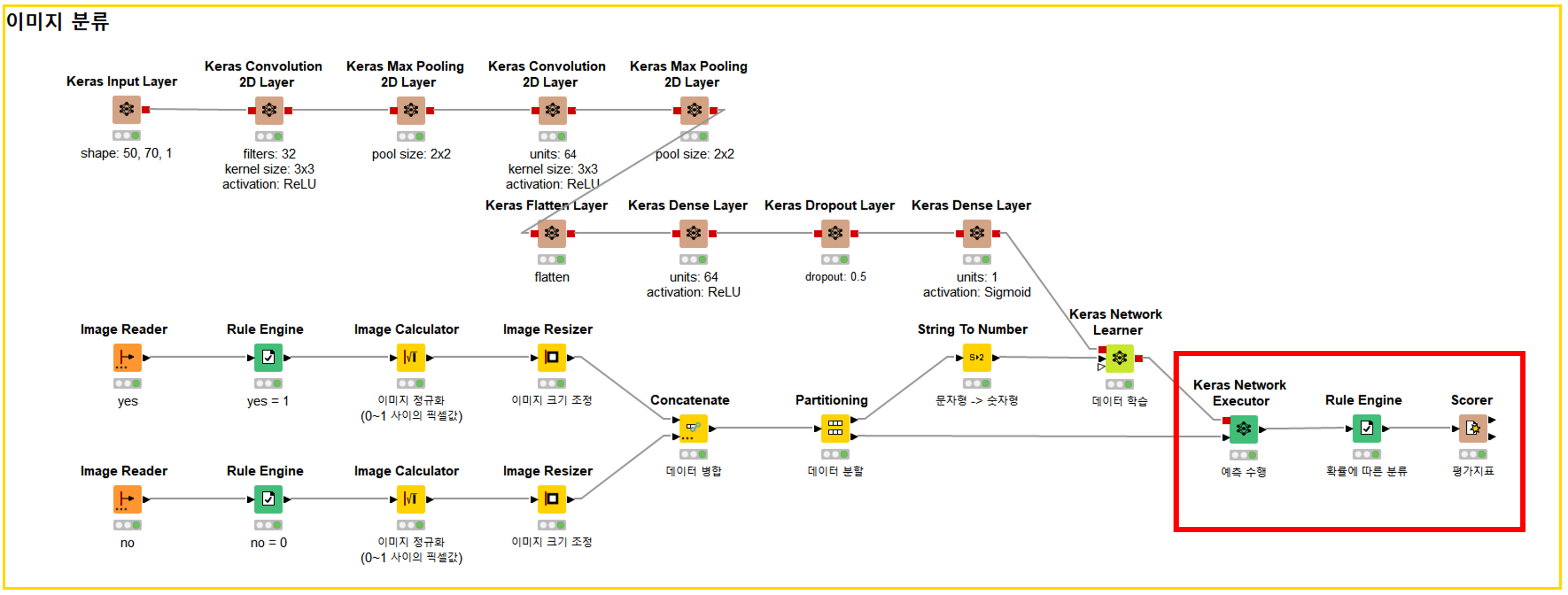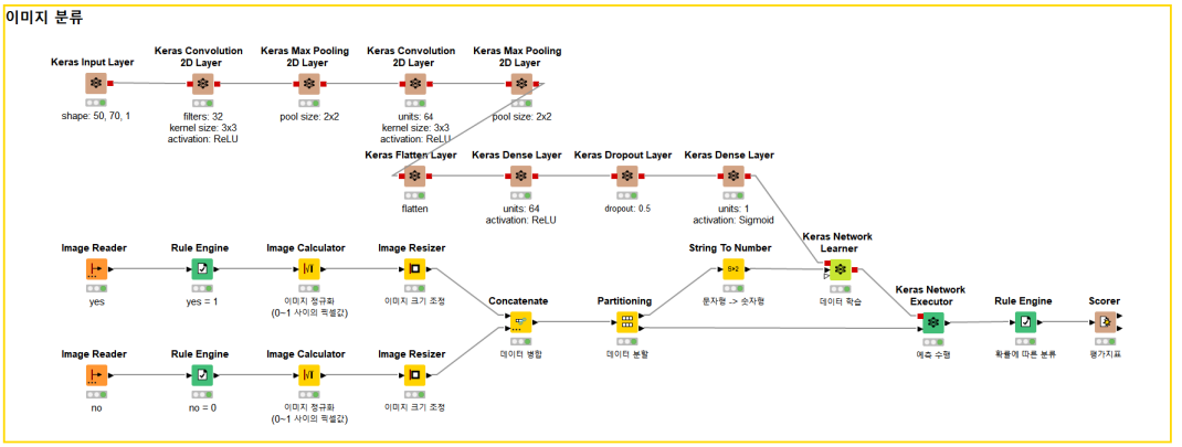 이 부분이 예측 알고리즘이에요. 이 알고리즘이 훈련 데이터와 함께 <Keras Network Learner>에 전달되면 데이터를 학습이 수행되어요.