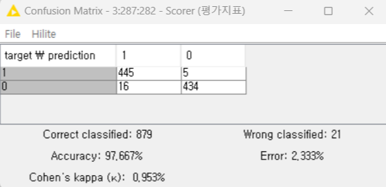 실제 정답을 제대로 예측한 건수(Correct classified)가 879건이고, 정답을 예측하지 못한 건수(Wrong classified)가 21건으로 정확도(Accuracy)가 97.667%예요.