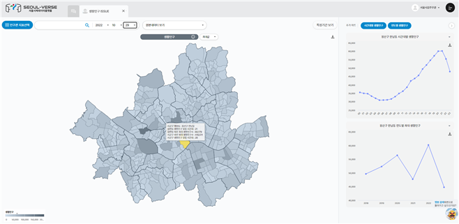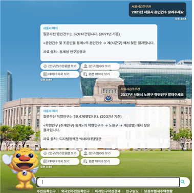 서울 인구관은 가구 변화, 인구 이동, 분포, 성장 등의 인구 지표를 사용자가 한눈에 알아볼 수 있도록 다양한 차트, 표, 지도 등으로 제공하는 지리정보체계(GIS)와 3D 메타버스 형태로 구성됐다. AI 챗봇 검색 서비스에서는 사용자가 서울시 기대 수명, 월세 가구 수, 구직 활동자 수, 실업률, 범죄 발생 현황 등 각종 정보를 질의하여 데이터와 통계 정보를 편리하게 조회하고 시각화 분석을 수행해 맞춤 데이터를 확인할 수 있다. 챗봇은 인구관과 연동돼 사용자 질의에 대한 답변과 관계되는 인구관의 특정 메뉴로 이동시킨다.
