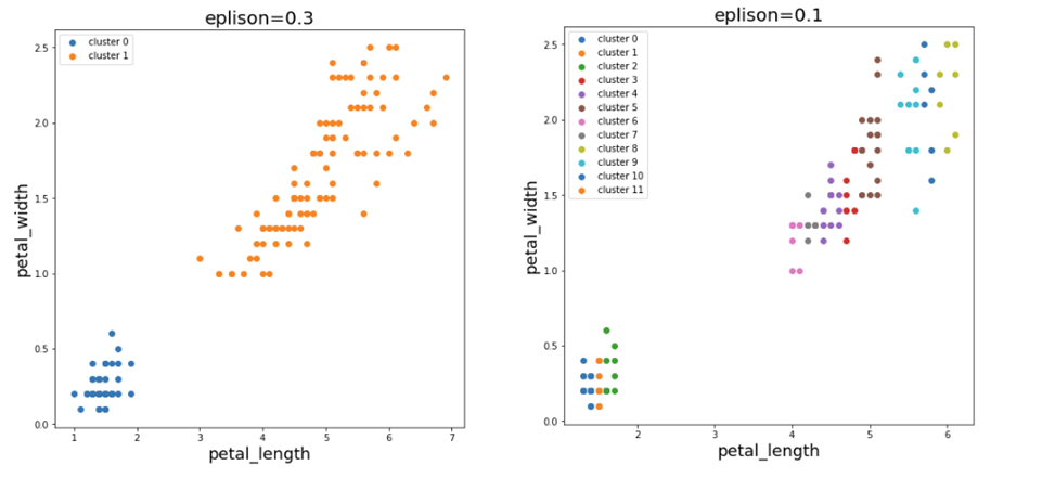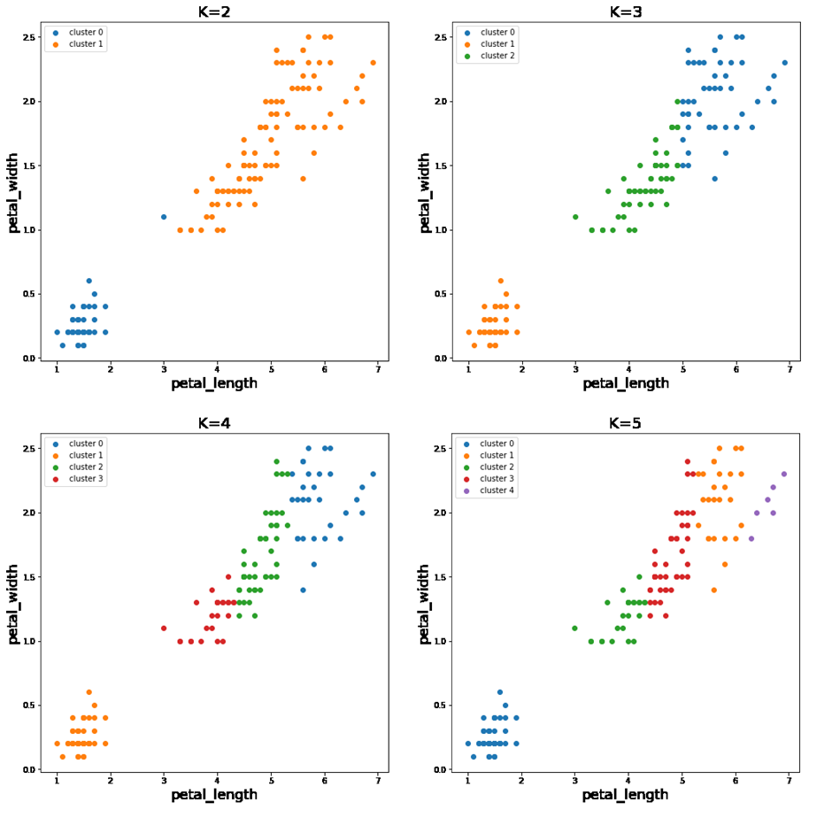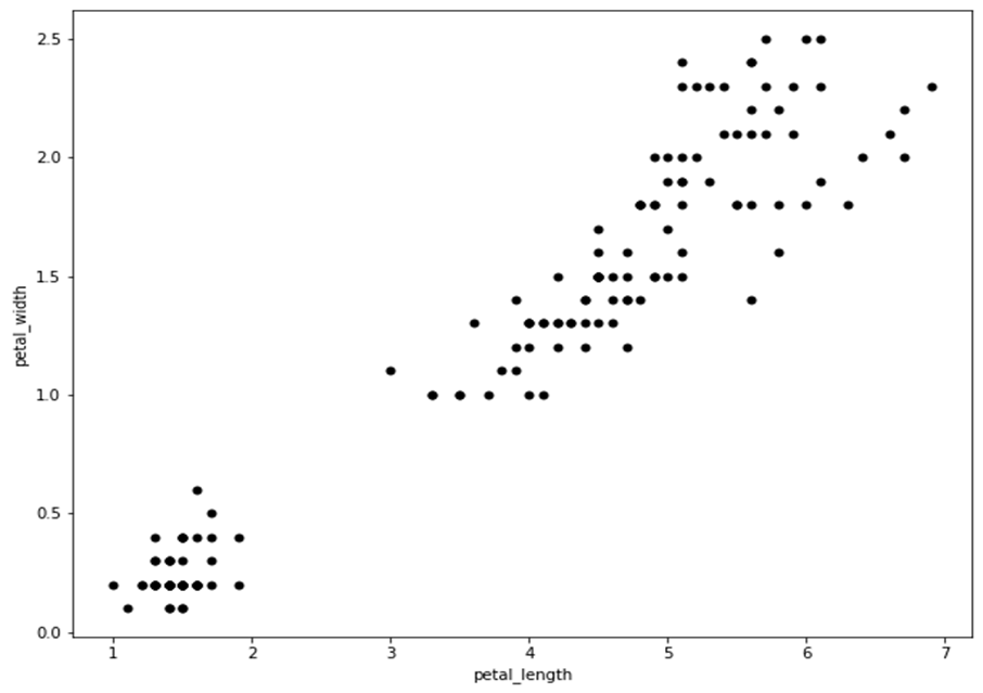 Out[2] 에서 petal (꽃잎) 에 대한 데이터만을 가지고 데이터의 분포를 해석하자면, 왼쪽 아래에 뭉쳐있는 데이터 집단과 우상단에 뭉쳐있는 나머지 데이터 집단, 총 2가지 군집으로 분리하는 것을 기대할 수 있겠습니다.