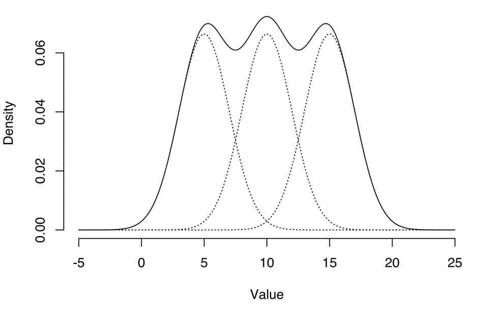 위 그림에서 하위 가우시안에 대한 정보를 모르는 상태로 해당 데이터셋을 만났다면 다음과 같은 상황일 것 이다.