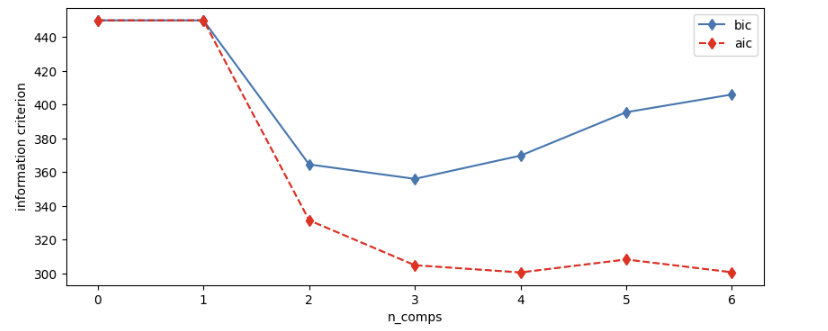 즉 ‘Information criterion’ 을 최소화하는 지점을 찾아 군집의 개수를 최적화할 수 있습니다.
