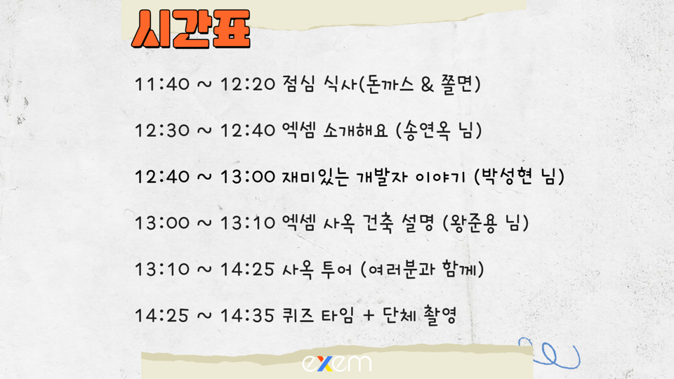 약 3시간에 걸쳐 진행될 프로그램의 기획자이자, 진행 요원들입니다. "여러분들과 함께 즐거운 여정에 동행해주실 분들입니다. 그리고, 엑셈은 '님'으로 소통합니다."