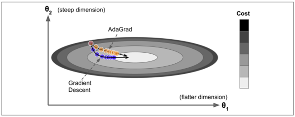 그림 AdaGrad 처럼 한쪽이 길쭉한 그릇 문제를 생각해보자. 경사 하강법은 전역 최적점 방향으로 곧장 향하지 않고 가장 가파른 경사를 따라 빠르게 내려가기 시작해서 골짜기 아래로 느리게 이동한다. AdaGrad 알고리즘은 가장 가파른 차원을 따라 그레이디언트 벡터의 스케일을 감소시켜 이 문제를 해결한다. 이 알고리즘은 학습률을 감소시키지만 경사가 완만한 차원보다 가파른 차원에 대해 더 빠르게 감소된다. 이를 적응적 학습률(Adaptive Learning rate)이라고 부르며, 전역 최적점 방향으로 바로 가도록 한다. 하지만, AdaGrad는 심층 신경망을 훈련할 때 너무 일찍 멈추는 경우가 있으므로, 간단한 2차 방정식 문제나 선형 회귀 같은 간단한 작업에 사용하는 것이 좋다.