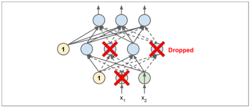 드롭아웃은 심층 신경망에서 가장 인기 있는 규제 기법 중 하나이다. 그림 드롭아웃과 같이 매 훈련 스텝에서 각 뉴런은 임시적으로 드롭아웃 확률 p에 따라 일부 뉴런을 비활성화 시킨다. 이런 파괴적인 방식이 잘 작동할지 의문이 들겠지만 의외로 신경망에선 확실한 성과를 낸다. 드롭아웃을 사용하면 입력값의 작은 변화에 덜 민감해지기 떄문에 보다 일반화된 네트워크를 만들 수 있다. 따라서 모델이 과대적합되었다면 드롭아웃 비율을 늘려 더 많은 노드를 비활성화시키면 된다. 한 가지 중요한 기술적인 세부사항이 있다. p=50% 로 하면 테스트하는 동안에는 하나의 뉴런이 훈련 때보다 두 배 많은 입력 뉴런과 연결된다. 이 점을 보상하기 위해 훈련하고 나서 각 뉴런의 연결 가중치에 0.5를 곱할 필요가 있다. 그렇지 않으면 각 뉴런이 훈련한 것보다 거의 두배 많은 입력 신호를 받기 때문에 잘 동작하지 않을 것이다. 이것을 일반화하면 훈련이 끝난 뒤 각 입력의 연결 가중치에 보존 확률을 곱하거나 훈련하는 동안 각 뉴런의 출력을 보존 확률로 나누어야 한다. Keras에서는 keras.layers.Dropout 층을 사용하여 구현한다.
