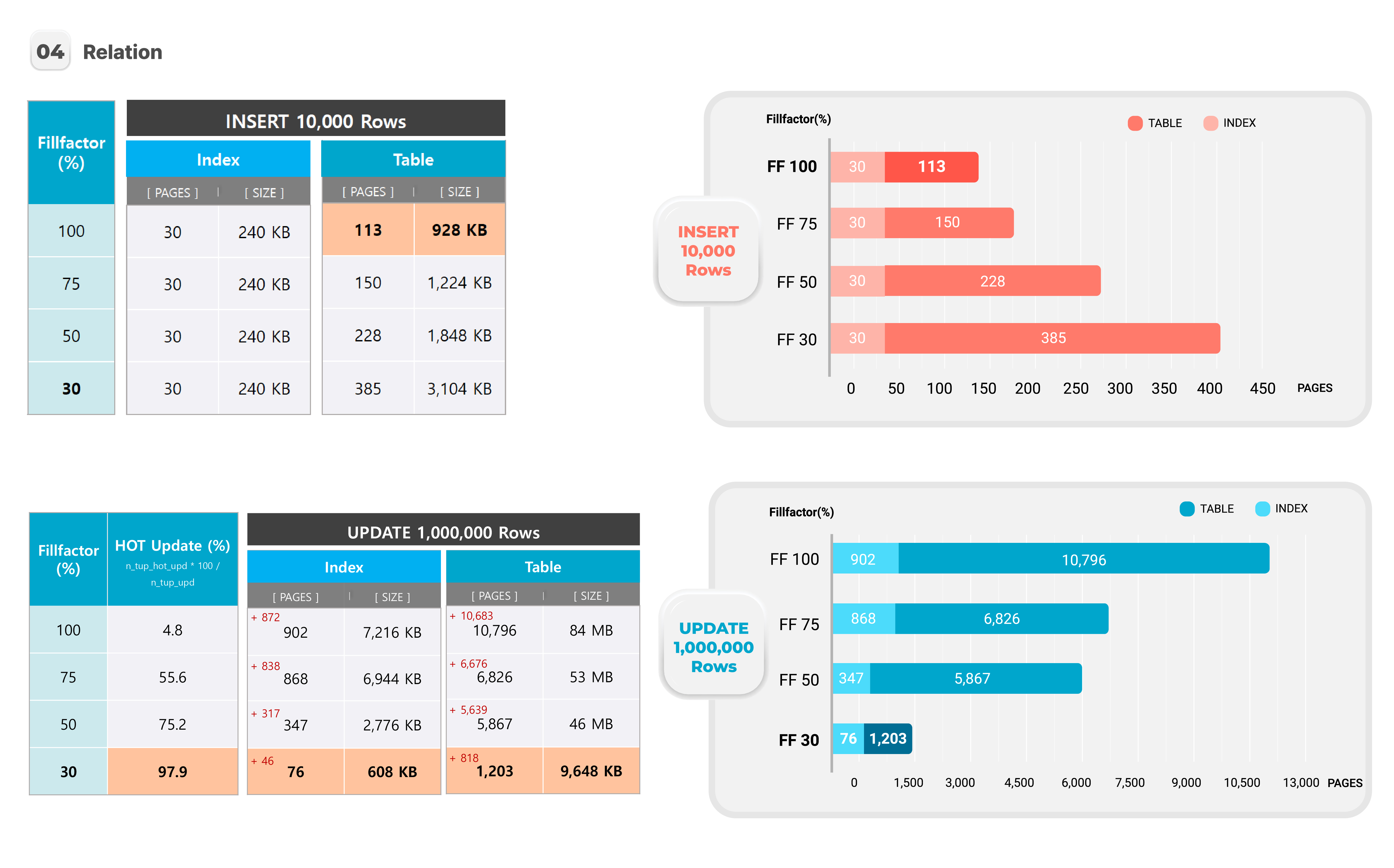 하지만 Update 수행이 반복될 경우 Fillfactor가 작은 테이블에서는 HOT Update의 발생 빈도가 높을 것이며, HOT Update 동작은 추가적인 인덱스 엔트리를 생성하지 않기 때문에 인덱스 사이즈 측면에서도 장점이 있습니다. - HOT Update는 WAL 발생량에도 영향을 미칩니다.