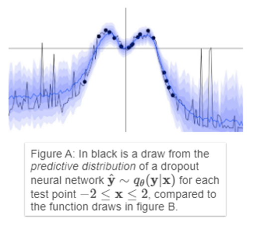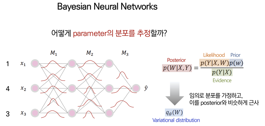 신경망의 Weight가 고정된 값이 아니라 어떤 분포가 된다면, 이처럼 예측 평균과 분산을 이용해서 예측 범위를 나타낼 수 있다. Weight가 분포가 되는 신경망을 베이지안 신경망이라고 하며, Weight는 Posterior Distribution이 된다. 예측할 때는, Posterior Distribution에서 샘플링 한 값을 이용하게 된다.