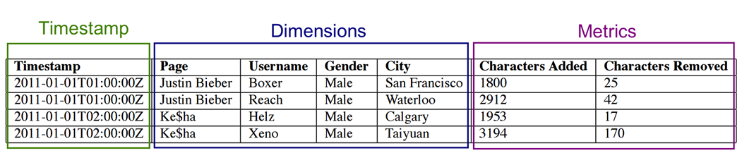 하나의 데이터 소스는 N개의 세그먼트로 구성되어 있습니다. 데이터와 인덱스를 시간 범위로 구분한 세그먼트에 저장합니다. 세그먼트 파일은 열 구조로 되어 있고, 각 열이 개별적으로 저장되기 때문에 쿼리에 필요한 열만 조회해 쿼리 시간을 줄일 수 있습니다. Timestamp, Dimensions, Metrics 3가지 기본 열 유형을 포함합니다.