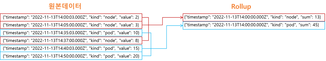 데이터를 수집하면서 동시에 집계를 하여 데이터를 적재하는 형태입니다. rollup이 이루어진 데이터에 대해 각각의 조회는 불가능하고, 중복이 없는 데이터를 rollup할 경우 성능이 저하됩니다. rollup은 middle manager에서 이루어지기 때문에 middle manager의 리소스가 부족할 경우 rollup 성능이 좋지 않거나 연산이 정확히 안될 수 있습니다.