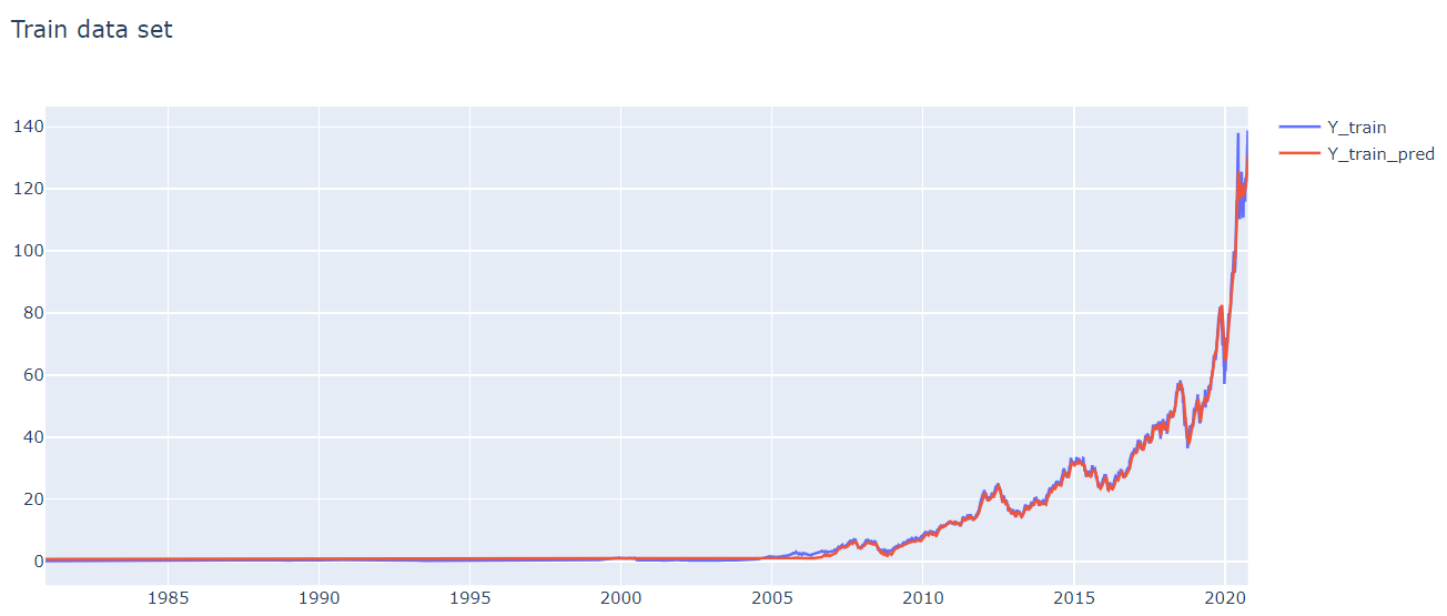 시각화를 위해 ploty-express 라이브러리를 사용하였다, 학습 데이터 셋의 예측 결과와 테스트 데이터 셋의 예측 결과를 각각 시각화하였다. 테스트 데이터 셋에서 예측값과 실제값의 차이는 존재하지만 예측 값이 실제 값의 전체적인 트렌드를 따라가는 것을 확인하였다.