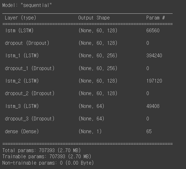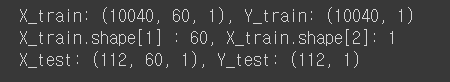 X_train 변수는 과거 60일의 정보를 갖고 있는 3차원 순차 데이터, Y_train 변수는 미래 1일의 정보를 갖고 있는 2차원 순차 데이터이다.