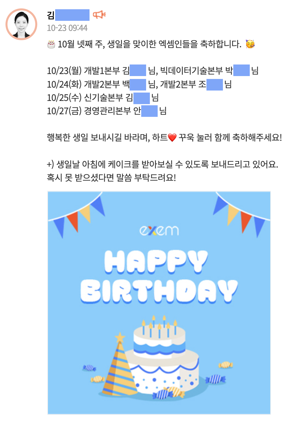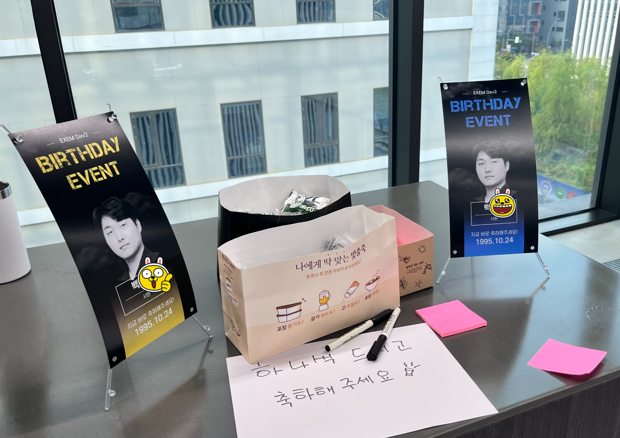 가족보다도 많은 시간을 함께 보내고 있는 엑셈 가족이기에 한분 한분의 생일도 너무나 소중합니다. 생일자에게 특별 메세지와 기프티콘을 발송합니다. 특별한 날 챙김을 받아 더욱 고마움이 큽니다.