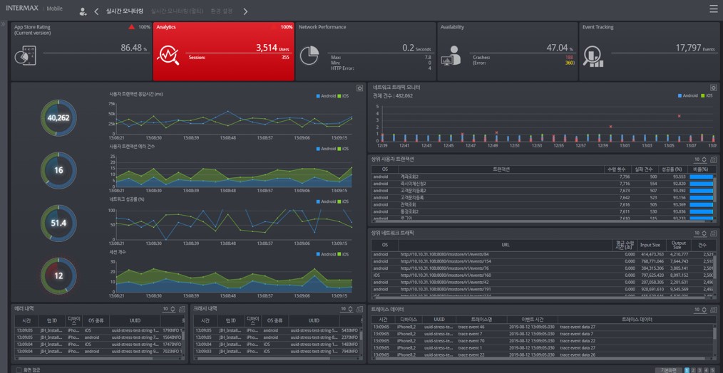 인터맥스 포 모바일은 모바일 앱 성능을 실시간으로 모니터링하는 솔루션입니다. 모바일 앱을 기반으로 운영되는 기업 서비스의 안정성 확보를 지원하죠. 저희 솔루션만의 강점이라면, 멀티 및 하이브리드 앱 모니터링 기능으로 2개 이상의 앱에 대한 동시 모니터링을 통합 대시보드로 제공합니다. 각기 다른 OS 버전, 앱 버전, 통신사, 앱 개수에 상관없이 하나의 화면에서 수많은 지표에 대해 실시간으로 모니터링이 가능하고, 앱 충돌이나 오류 발생 시 상세한 분석이 가능해 앱 개발자의 앱 기능 개선에도 도움을 줍니다.