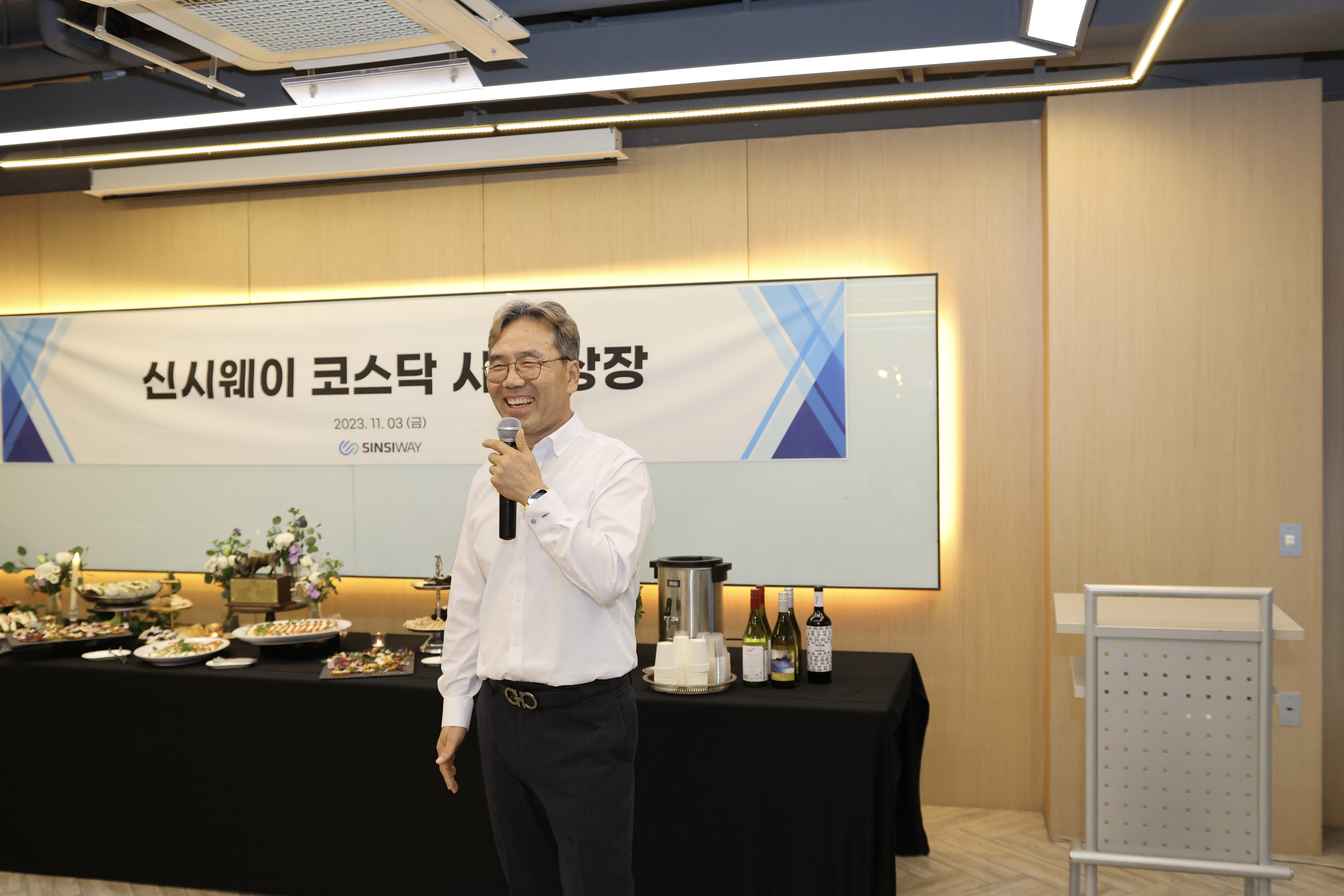 한국거래소에서의 기념식을 마치고, 신시웨이 본사에서도 상장의 기쁨을 모든 임직원들과 나누기 위해 행사가 진행되었습니다. 참여가 어려운 제주 및 대전 지사와 외근직 분들은 화상으로 연결해서 모두가 함께한 가운데, 축배를 들며 신시웨이의 상장을 축하하고, 앞으로의 도약을 다짐했습니다.