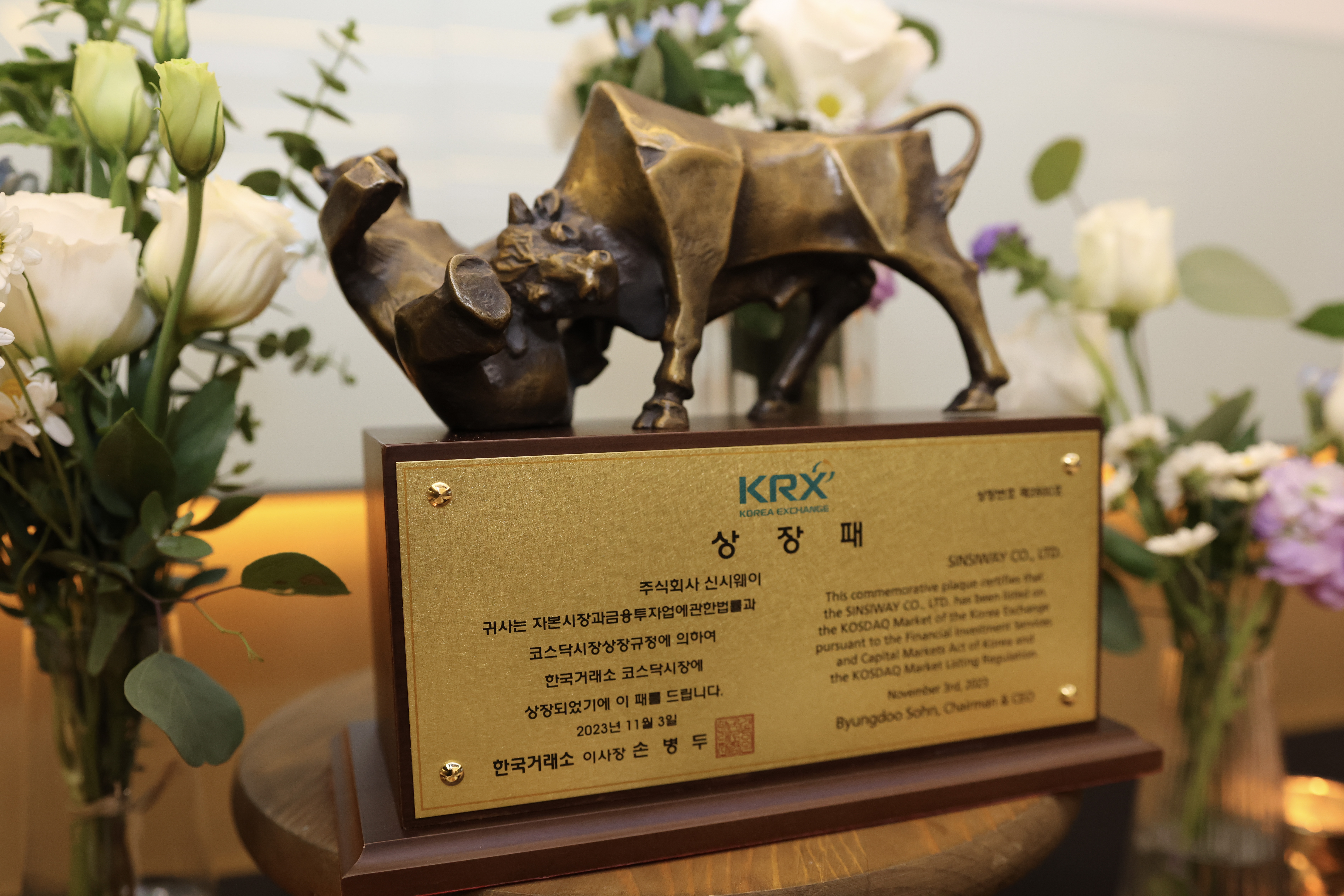 이 날 오전 9시부터 서울 여의도에서 상장 기념식이 개최되었습니다. 신시웨이의 주력 사업과 핵심 가치 소개 영상이 상영되었고 이후 상장계약서 서명 및 상장패, 축하패 수여가 진행되었습니다. 상장패 모양이 좀 재미난데요? 곰을 들이박고 있는 황소 한마리가 눈에 띕니다. 쿵!