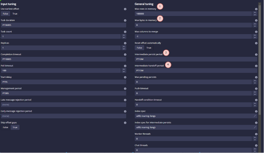 | 4 | Intermediate handoff period | 적재된 파일을 일정 시간마다 Deep Storage로 전송하는 주기를 설정합니다. |