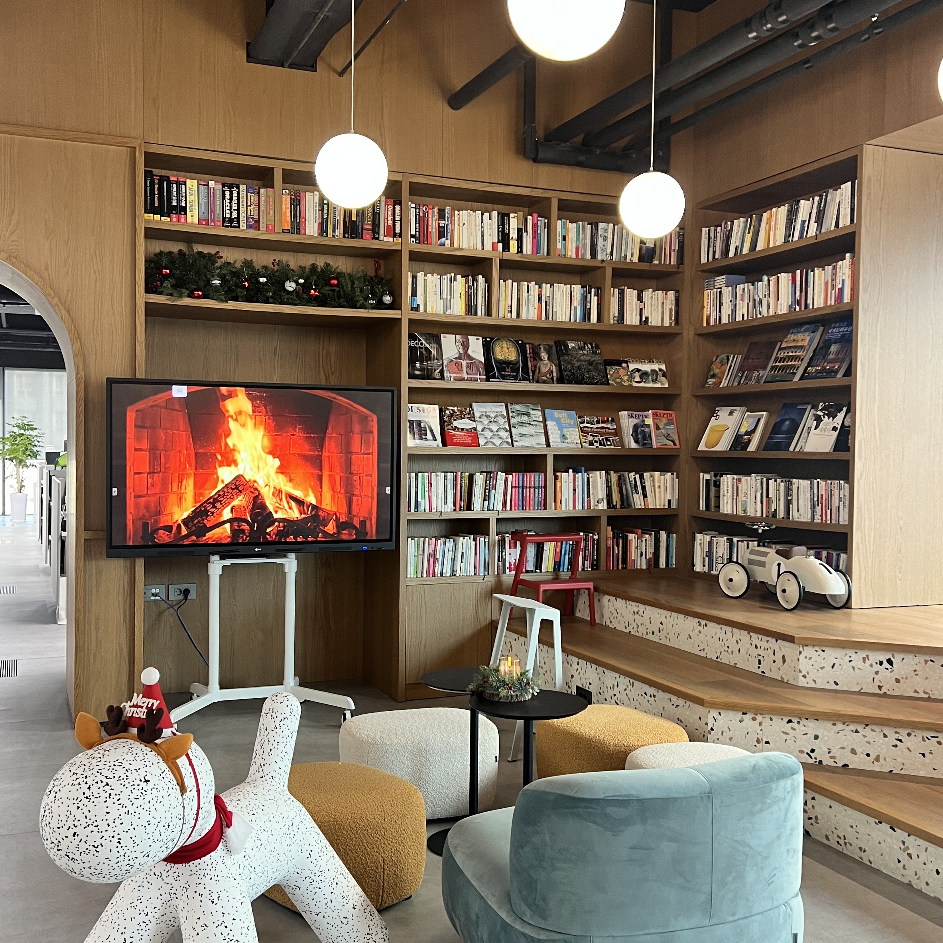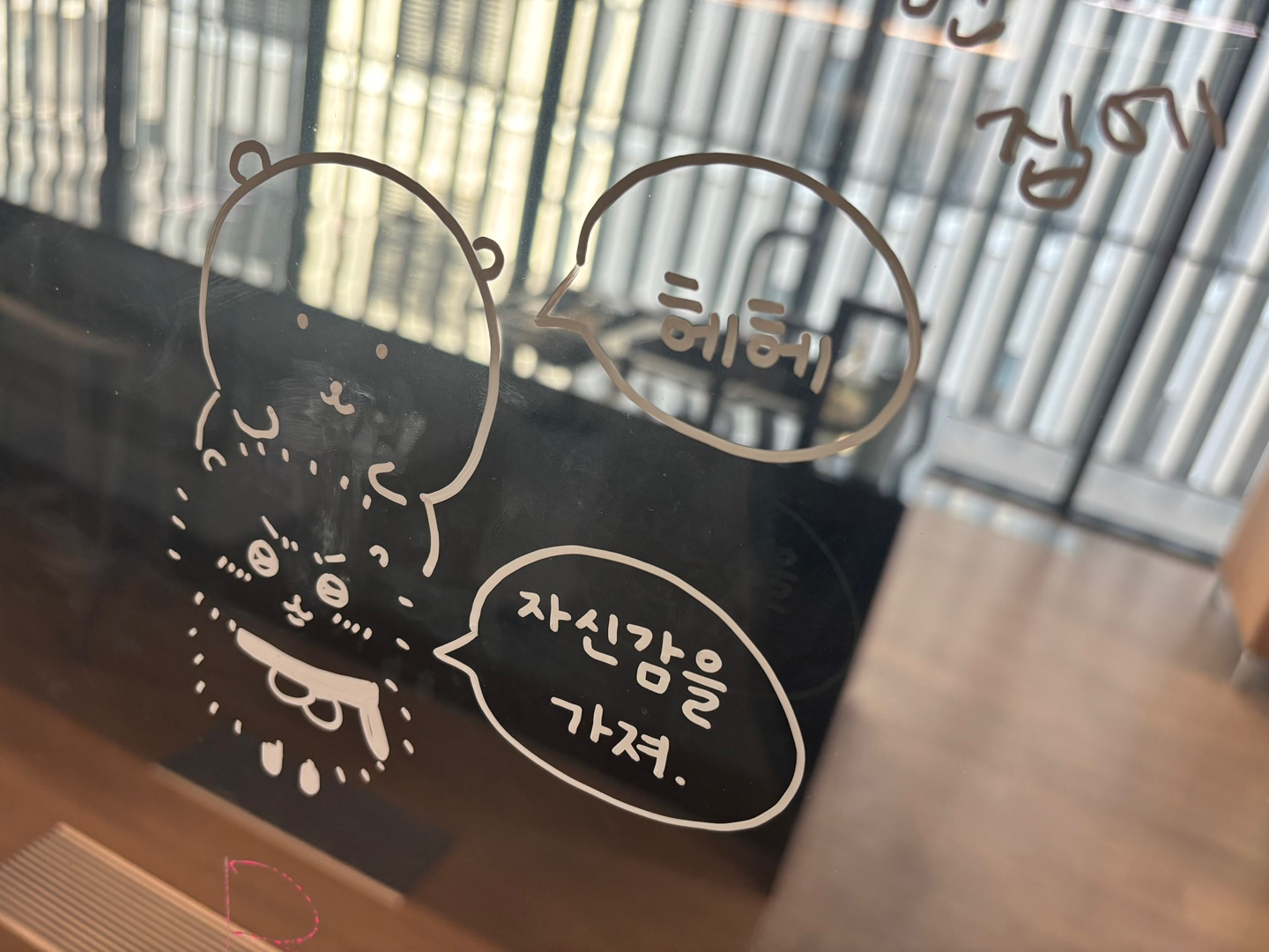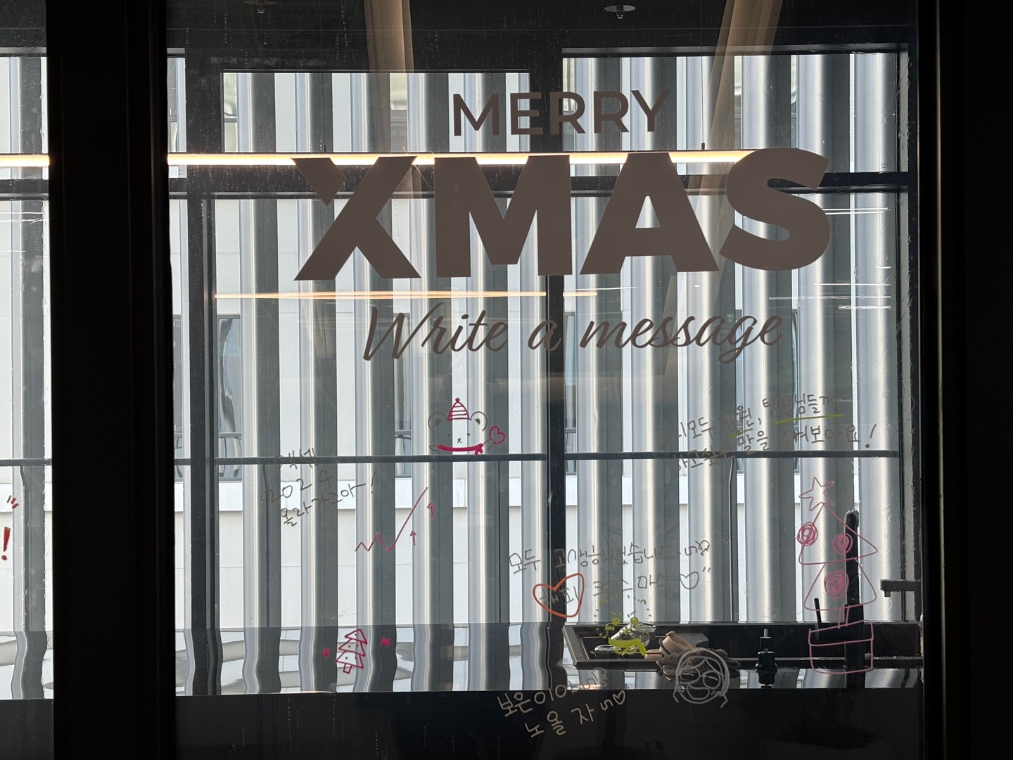 크리스마스 시즌에만 볼 수 있는 ‘벽난로’ 입니다. 괜시리 따뜻해지는 느낌적인 느낌! 시린 손도 가져가 보구요! 점심 후에 엑셈 추천 음료 '아몬드라떼’를 마시면서 불멍하는 게 힐링이 되었습니다. 마주보는 마지스퍼피에게도 크리스마스가 찾아왔네요 :)