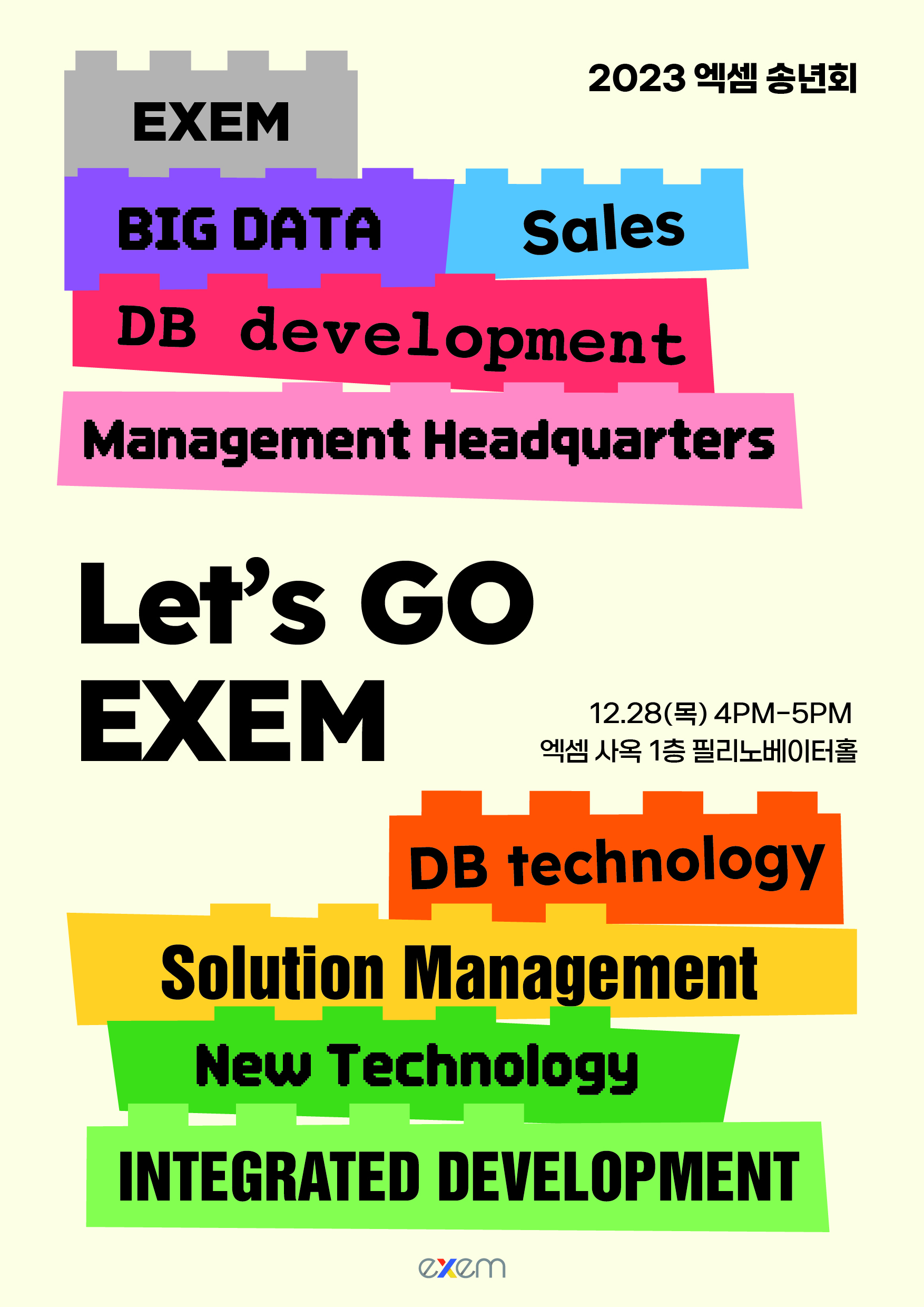 송년회 포스터부터 남다르죠? 레고 브릭이 엑셈의 독립적인 각 본부를 나타내고, 브릭들을 조립해 하나의 엑셈으로 완성하는 모습입니다. 오 신선해!