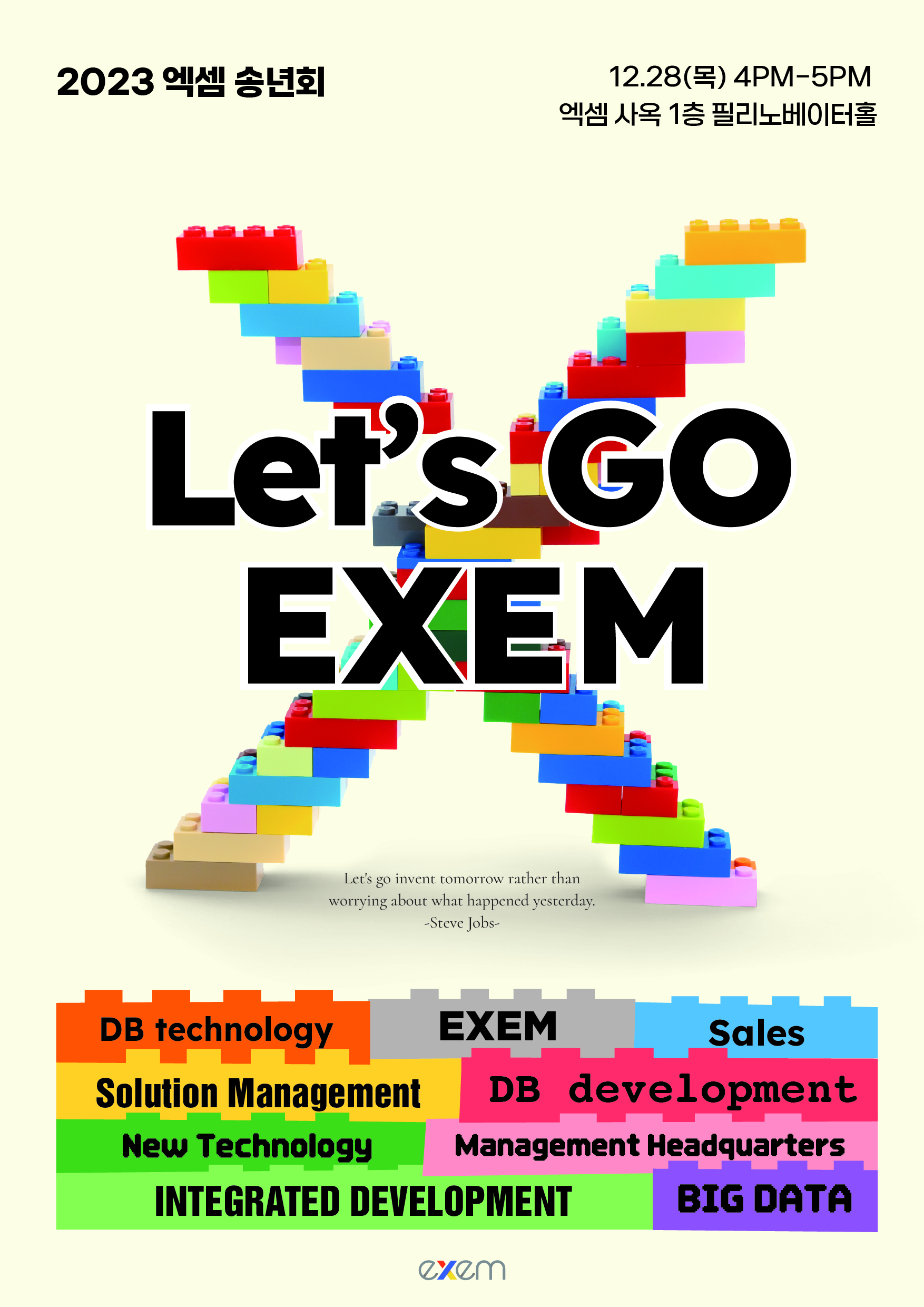 송년회 포스터부터 남다르죠? 레고 브릭이 엑셈의 독립적인 각 본부를 나타내고, 브릭들을 조립해 하나의 엑셈으로 완성하는 모습입니다. 오 신선해!