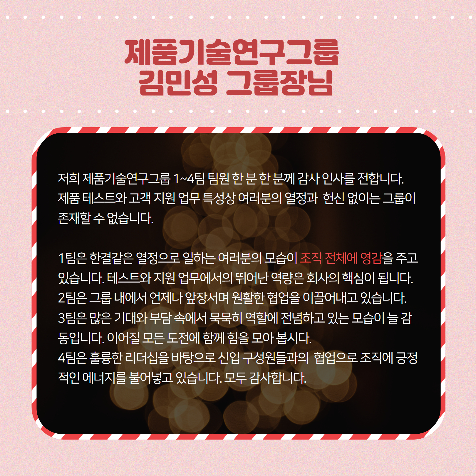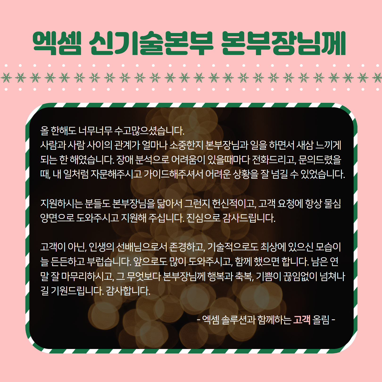 엑셈 여러본부 중 기술 지원팀은 특히 고객분들과 보내는 시간이 많습니다. 솔루션을 통해 인연을 맺고 지원 과정 속에서 자주 보고 소통하다보면 고객도 한 팀과 같이 일을 하게 됩니다. 서투를 때도 있지만, 고객 환경을 공감하고, 같이 위기를 극복하면서 지지고 볶다 보면, 이를 알아봐주시는 고마운 분들이 참 많이 계십니다. 눈빛만으로도 알지만 :) 그냥 지나치지 않고 표현해주셔서, 뭉클하게 힘내 봅니다.