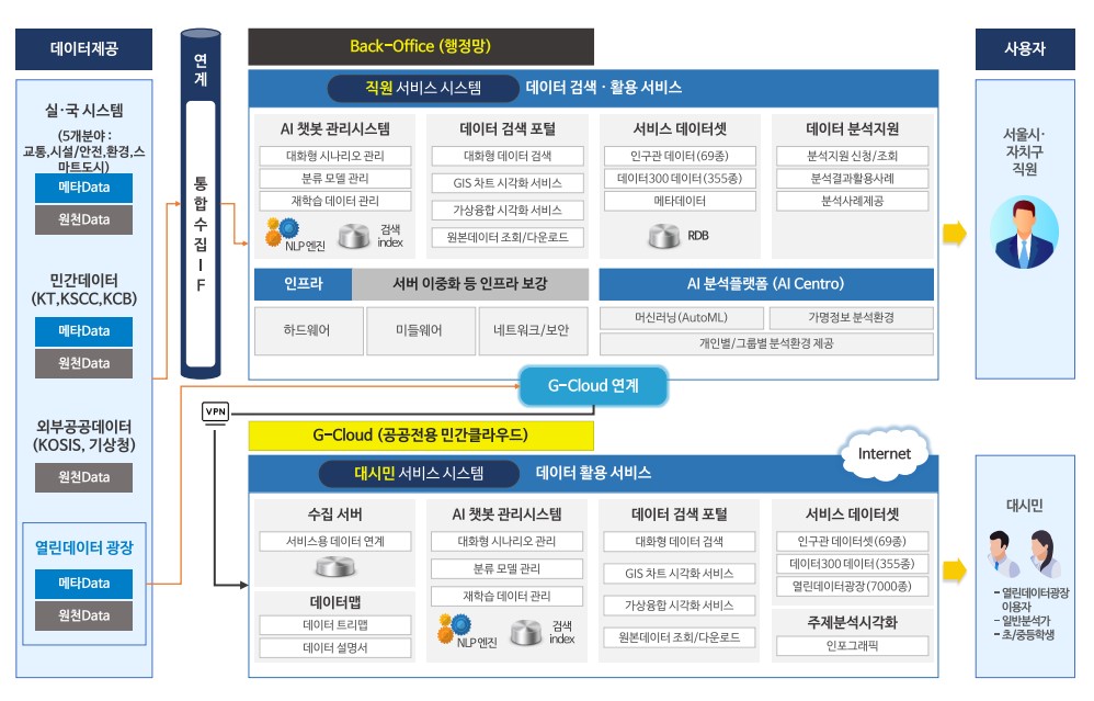 아울러 금번 사업에서는 대시민 서비스 구현을 위한 공공 클라우드가 최초 도입된다. 공공기관 필수 보안인증인 CSAP 인증을 획득한 네이버 G클라우드가 구축되며, 빠른 장애 복구를 제공할 수 있는 클라우드 네이티브 기술이 적용된 MSA 환경으로 구성된다. 대시민 서비스, 챗봇 검색 서비스, 서울 인구관에 활용되는 데이터셋이 G클라우드에 이관된다. 또한 2단계부터 도입된 서울시 내부 직원용 AI 분석 플랫폼의 기능이 고도화되고, 서울시 직원을 대상으로 교육 프로그램이 운영될 예정이다.