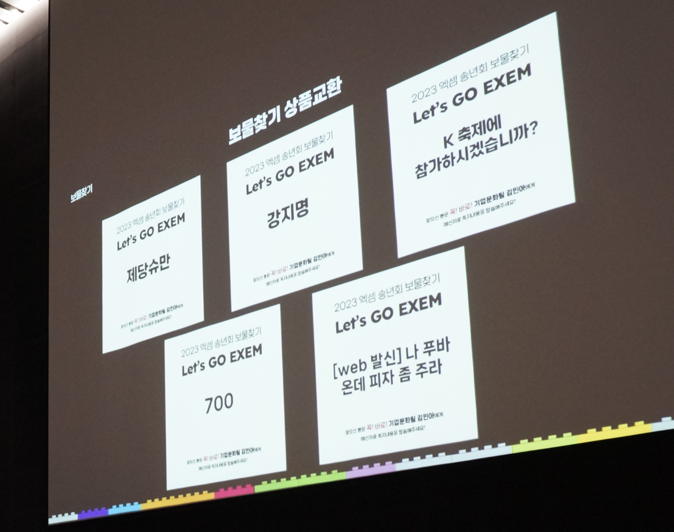 이어, 송년회에 앞서 진행했던 보물찾기의 1등과 꽝을 발표하는 중요한 순서가 진행되었습니다. '제당슈만, 강지명, K 축제에 참가하시겠습니까?, 700, 나 푸바온데 피자 좀 주라'의 메세지가 적힌 보물 쪽지를 찾은 직원들은 대박 선물을 받았을까요? 아쉬운 선물을 받았을까요?