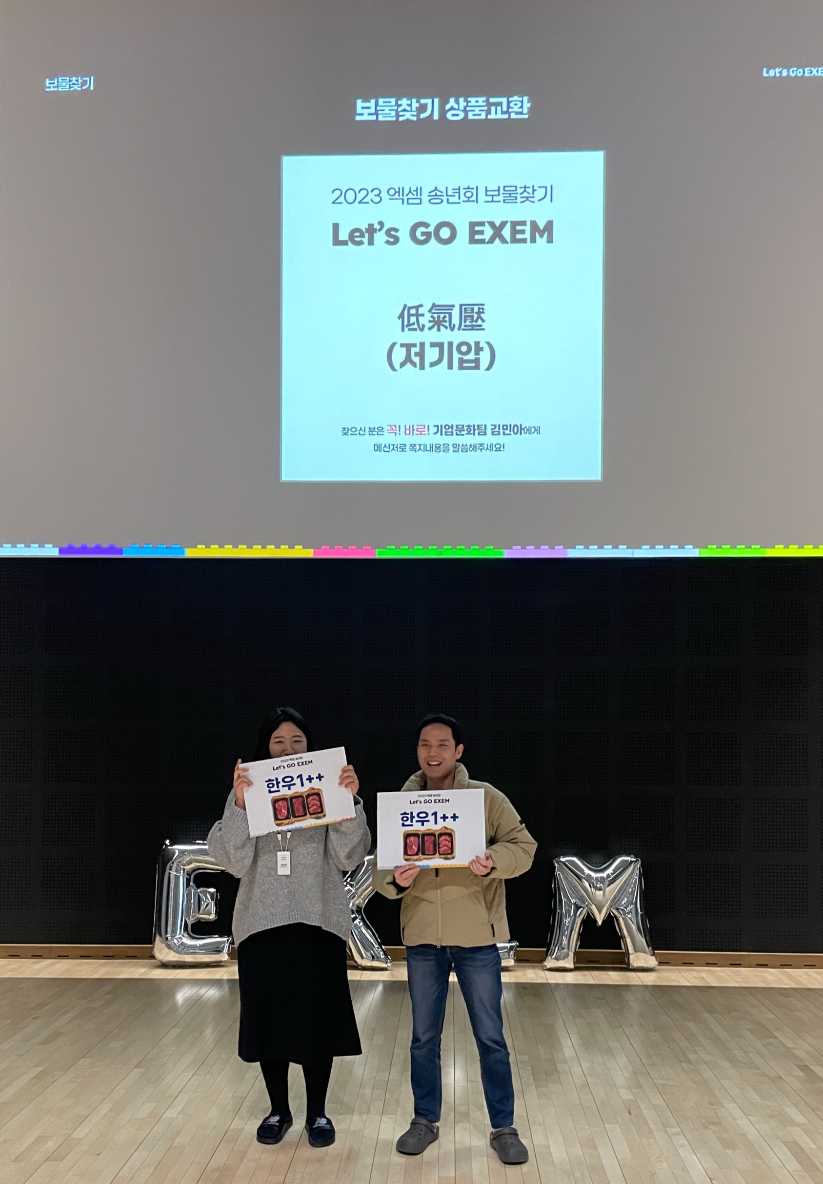 2023년 12월 28일, 엑셈 사옥에서 송년 파티가 열렸습니다. 송년회 2주 전 이벤트 전사 공지가 도착했고, 연말 분위기에 더해 직원들의 즐거운 참여가 이어졌습니다.