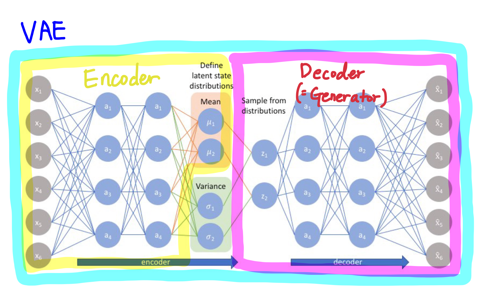 변이형 오토인코더의 인코더는 입력 데이터의 평균과 표준편차를 찾는다. 이렇게 얻은 평균과 표준편차를 갖는 가우시안 잡음에서 샘플링한 데이터가 디코더에 입력된다. 즉, 훈련이 끝난 변이형 오토인코더는 코딩영역에 저장된 평균과 표준편차를 갖는 가우시안 잡음에서 샘플링되기 때문에 확률적 오토인코더의 특징을 갖으며 잡음이 디코딩된 출력은 실제 데이터와 유사하므로 생성적 오토인코더의 특징을 갖는 것이다.